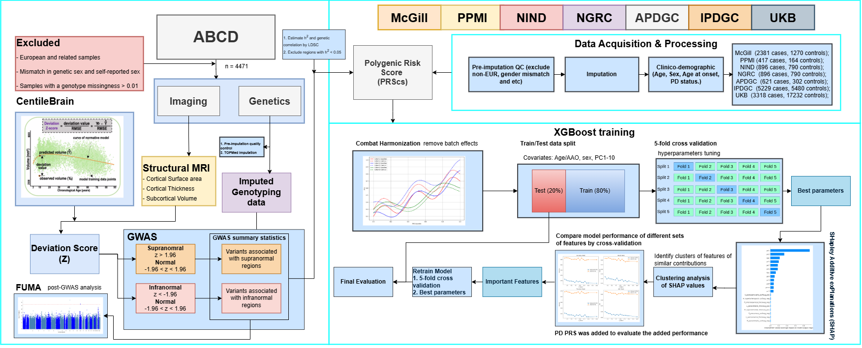 Method: We acquired adolescent brain structural MRI data for cortical thickness, surface area, and subcortical volume from the Adolescent Brain Cognitive Development study and calculated their deviation scores using normative modeling via CentileBrain, which estimates individual deviations from a normative reference population[3]. Brain regions were classified as supranormal and infranormal if their deviation scores fell outside the range of [-1.96,1.96][4]. For each brain region, we then conducted a genome-wide association study (GWAS) to identify genetic variants associated with deviations. Using the GWAS summary statistics, we computed PRS for 7 PD cohorts (13,988 PD cases and 27,203 controls, Fig. 1). We then implemented a two-step XGBoost modeling approach to predict PD status. In the first step, we trained an XGBoost model using all features to identify the most important contributors to PD prediction based on SHapley Additive exPlanations values. Finally, we refined the model with only the selected important features.