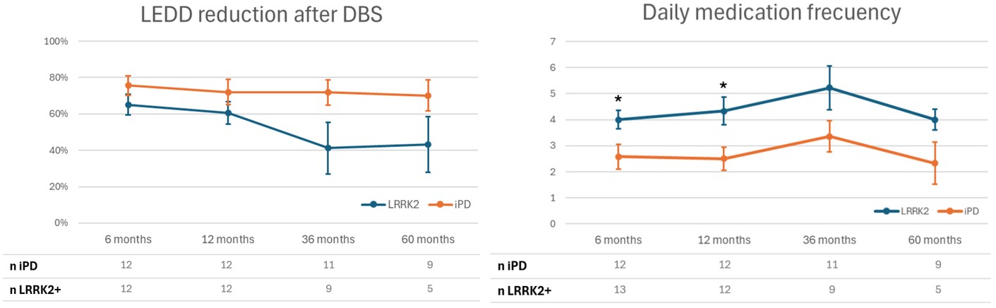 During postoperative follow-up, LRRK2-PD patients reported fewer cognitive symptoms (50% vs. 14%, p=0.03) and lower incidence of hallucinations/psychosis (5% vs. 23%, p=0.15). LRRK2-PD patients showed less reduction in UPDRS III (25% vs. 58%, p=0.03) and higher scores on post-surgical UPDRS IV at six months (8.8 vs. 1.3, p<0.01). They also exhibited a smaller reduction in LEDD and a higher number of daily medication doses at 6, 12, 36, and 60 months of follow-up, with these differences being sustained, though not reaching statistical significance (see Image 1). No differences were found in the number of therapeutic adjustments needed after DBS. However, two LRRK2-PD patients with refractory symptoms (disabling dyskinesia and dystonia) after 3 years of STN-DBS required additional advanced therapies: unilateral GPi-DBS and foslevodopa infusion, respectively.