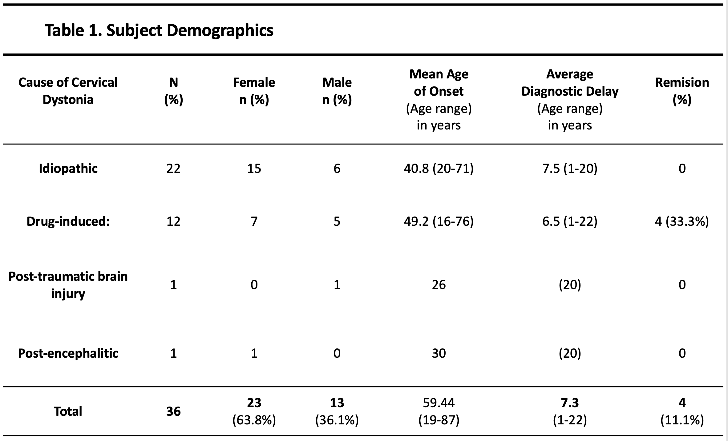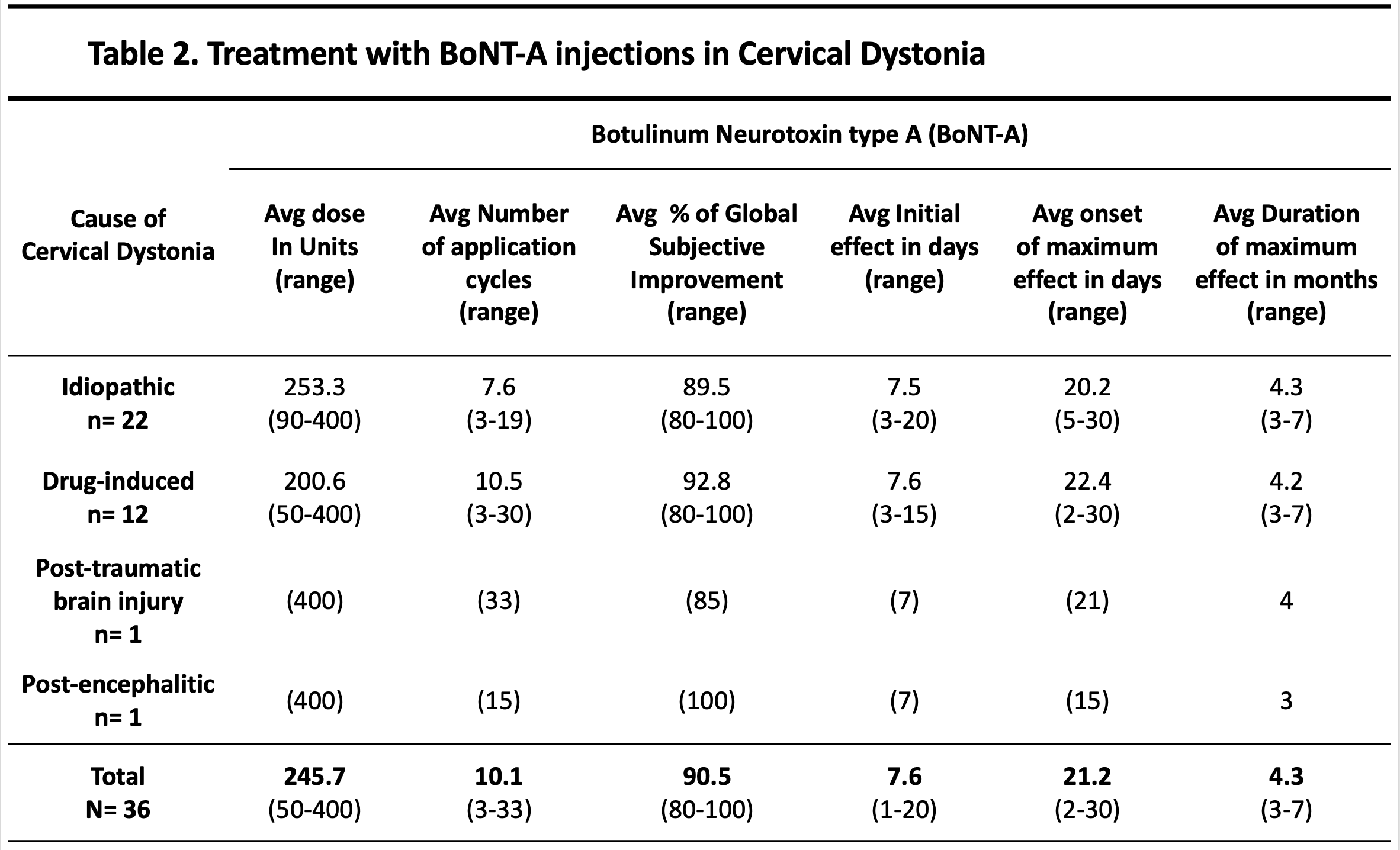 Results: Out of 56 subjects with cervical dystonia (CD), 36 met the inclusion criteria. 63.8% of the subjects were female (23) and 36.1% were male (13). The mean age of onset for CD was 59.4 (19-87) years and average delay in diagnosis was 7.3 (1-22) years. Idiopathic CD was the most common form (61.1%), followed by drug-induced (33.3%). Haloperidol was the most common neuroleptic associated with drug-induced CD, followed by Cinnarizine (Table 1). Subjects received an average dose of BoNT-A of 245.7 units (90-400), with and average of 10 application cycles (3-33). Mean score of subjective global improvement was 90.5%, with a maximum duration of therapeutic effect of 4.3 months (3-7) (Table-2).