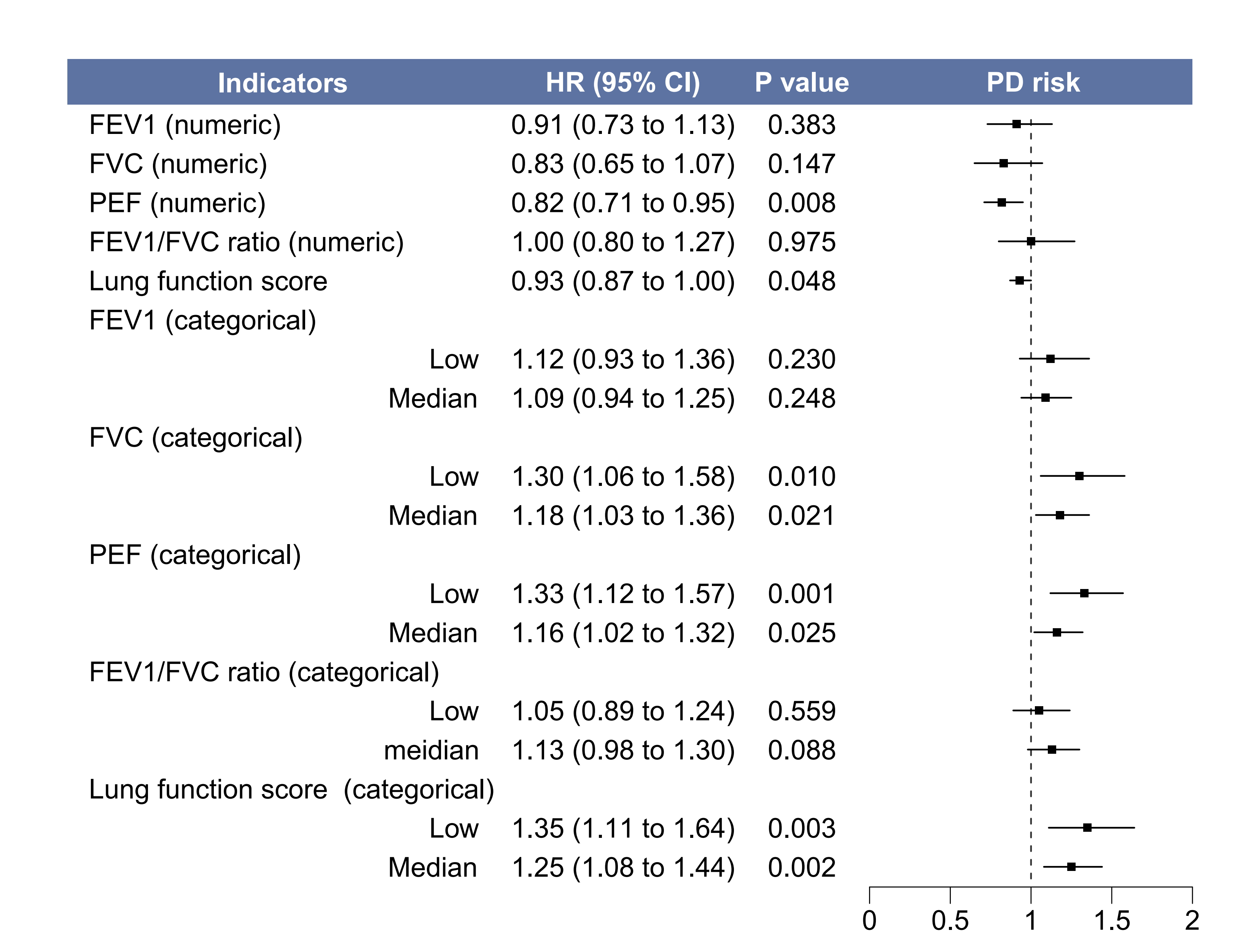 Method: Based on the UK Biobank, Cox proportional hazards models were to investigate the relationship between lung function measurements, including forced vital capacity (FVC), forced expiratory volume in one second (FEV1), and peak expiratory flow (PEF), and FEV1/FVC, and the risk of PD. Furthermore, the study constructed a lung function score and explore the relationship between the lung function score and PD risk. The study also conducted mediation analysis using blood inflammatory markers and metabolic indicators as mediators.
