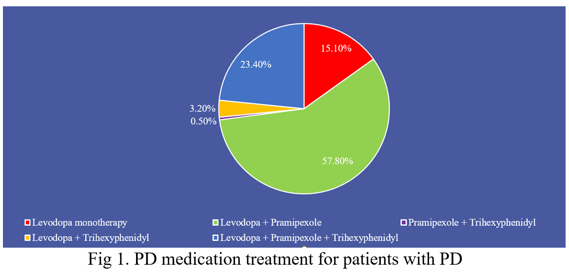 Results: Among 218 Parkinson’s patients, 33 (15.1%) patients received levodopa monotherapy, 126 (57.8%) patients received combination therapy of levodopa and dopamine agonists, 07 (3.2%) ) patients received combination therapy of levodopa and trihexyphenidyl, 1 (0.5%) patient received combination therapy of dopamine agonist and trihexyphenidyl, and 51 (23.4%) patients received combination therapy of both levodopa, dopamine agonist and trihexyphenidyl (Figure 1). A total of 217 patients were prescribed levodopa at a median dose of 375 mg. The median daily levodopa equivalent dose was 500 mg. A total of 177 patients (81.2%) used the dopamine agonist (pramipexole) with a median dose of 0.75 mg. 27.9 % of patients used an anticholinergic drug (trihexyphenidyl) with a median dose of 2 mg. The proportion of Parkinson’s disease patients with motor complications was 32.6%.