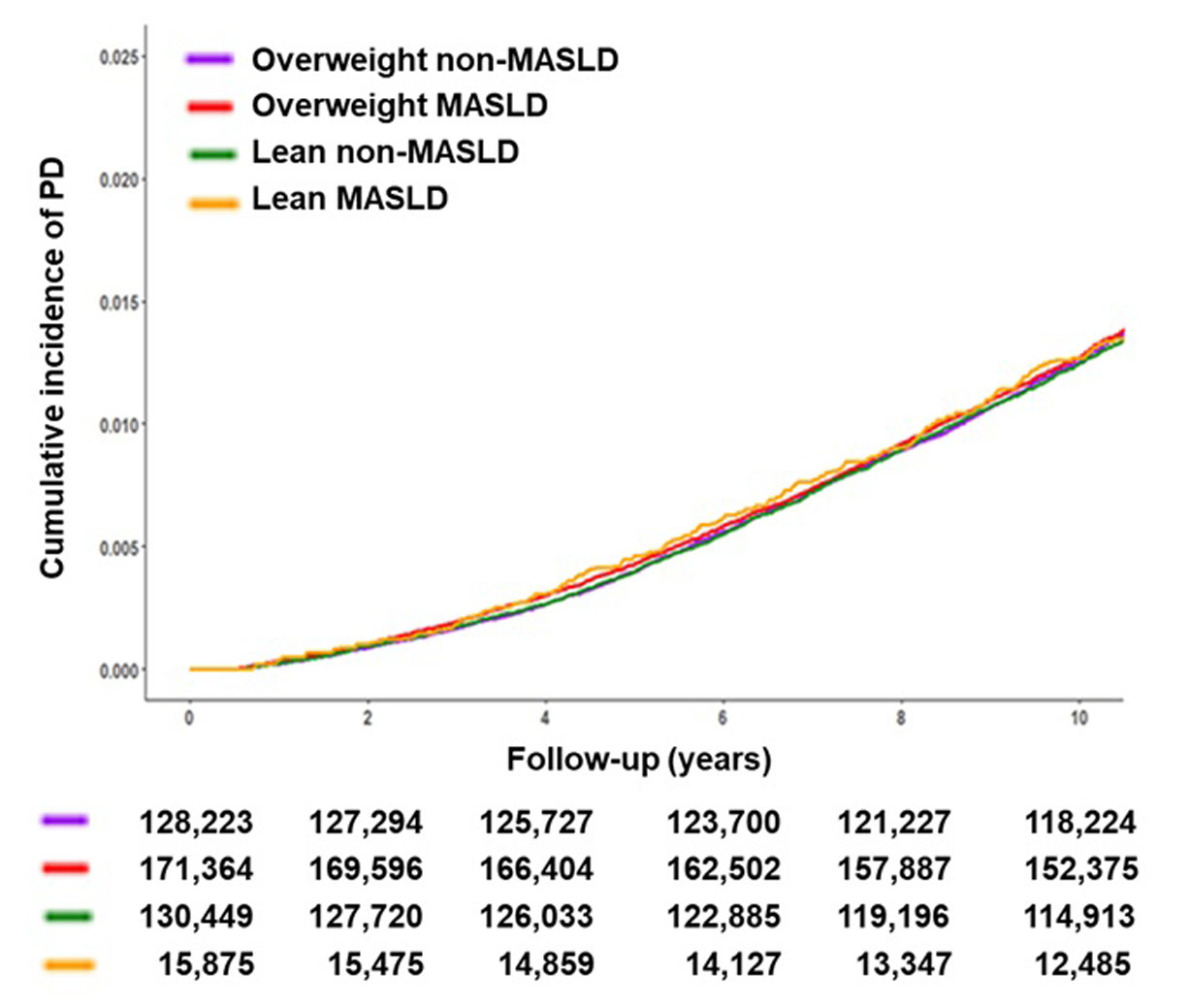 Results: This cohort included 445,921 PD-free participants with 66-years-old at baseline. According to the presence of MASLD and overweight status, participants were categorized into four groups: overweight non-MASLD (28.8%), overweight MASLD (38.4%), lean non-MASLD (29.3%), and lean MASLD (3.6%). During the follow-up period (10.4 years), 6,240 (1.4%) individuals were newly diagnosed with PD. There was no difference in the risk of PD between the MASLD subtypes: compared to the overweight non-MASLD (reference), the adjusted hazard ratios [95% confidence interval] for PD were 1.00 [0.94–1.06] for overweight MASLD, 0.99 [0.93–1.06] for lean non-MASLD, and 1.08 [0.94–1.25] for lean MASLD.