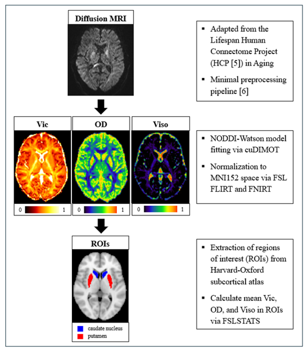 Method: 19 WD patients and 19 age- and sex-matched healthy controls underwent 3T multi-shell dMRI and were evaluated using the Unified WD Rating Scale neurological subscale (UWDRS-N) and the Montreal Cognitive Assessment (MoCA) [Table 1]. The CUDA diffusion modelling toolbox (cuDIMOT [4]) of the FMRIB Software Library (FSL) was employed to estimate the intra-cellular volume fraction (Vic; indicating neurite density), orientation dispersion (OD; indicating axonal and dendritic dispersion), and isotropic volume fraction (Viso; indicating cerebrospinal fluid) of the NODDI model [1]. The processing steps for dMRI data are summarized in [Figure 1]. Diffusion metrics were compared between groups using Mann-Whitney U tests, and their associations with clinical scores were explored using Spearman’s correlations in SPSS Statistics. A Bonferroni-corrected p ≤ .05 was considered significant.