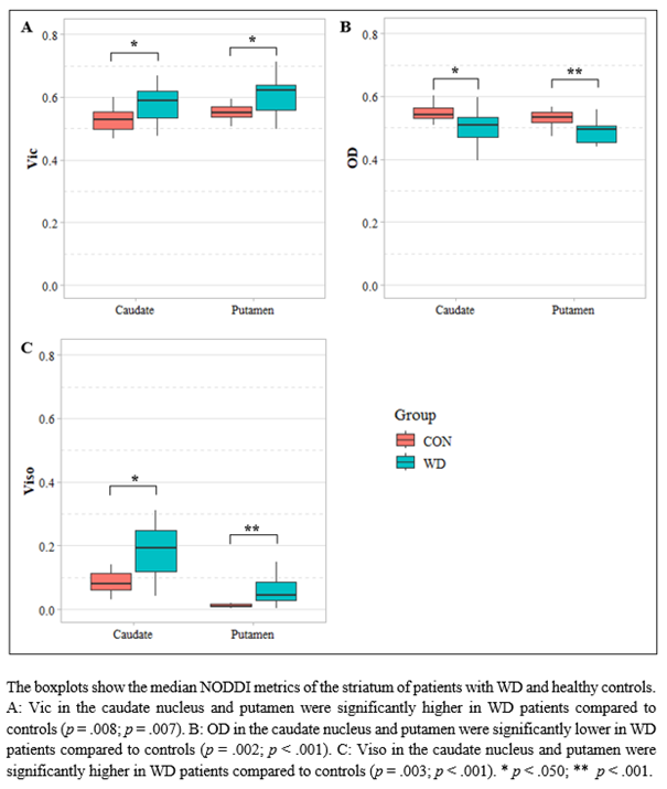 Conclusion: Consistent with prior research [2,3], we demonstrated increased Viso and diminished OD in the striatum of WD patients, which may reflect axonal loss, myelin damage, decreased dendrite density, and spongiform degeneration. The elevated Vic in patients may indicate a compensatory mechanism that increases neurite density under decoppering treatment. Increased Viso of the putamen was correlated with greater neurological and cognitive impairment, suggesting it may serve as a valuable biomarker for clinical symptoms in WD.