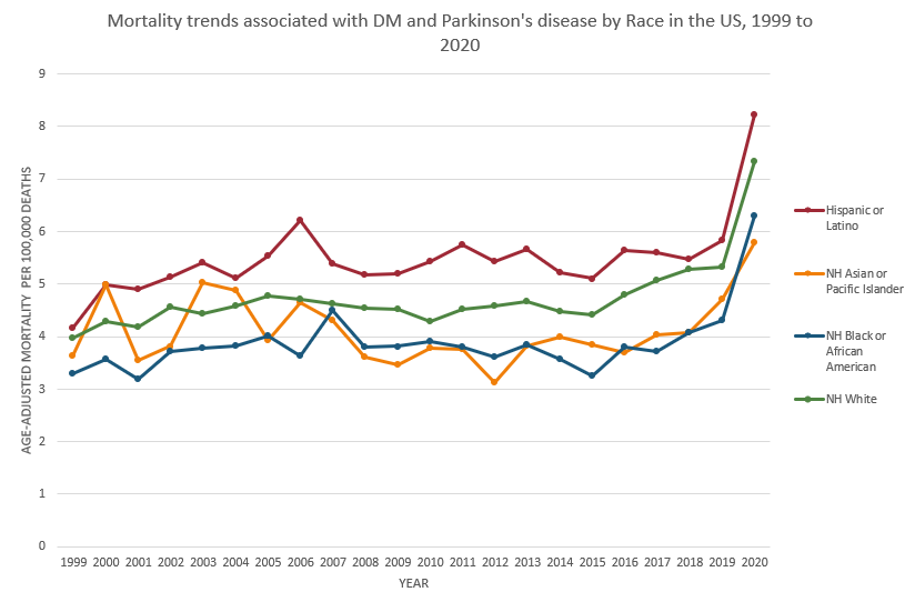 Objective: To assess the mortality trends and disparities associated with Parkinson’s disease in diabetic patients in the U.S.