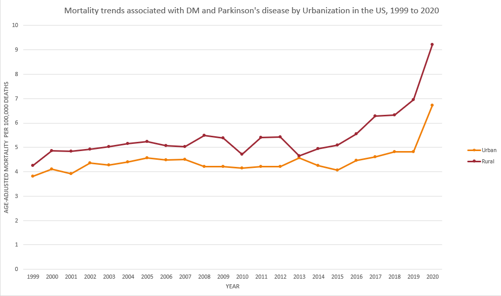 Results: From 1999 to 2020, 72,059 deaths were recorded due to PD in adults ≥55 with DM. The AAMR increased from 3.91 in 1999 to 5.12 in 2018 (APC: 0.56, 95% CI: 0.17–0.95), then surged to 7.17 in 2020 (APC: 21.5, 95% CI: 10.02–34.21). Males had higher AAMRs than females (7.29 vs. 2.98). Among racial groups, AAMRs were highest in Hispanic/Latino (5.61), followed by Non-Hispanic (NH) White (4.77), NH Asian/Pacific Islander (4.15), and NH Black/African American (3.93) populations. The Midwest had the highest AAMRs (5.3), followed by the West (4.9), South (4.5), and Northeast (4.0). Rural areas had persistently higher AAMRs than urban areas (5.51 vs. 4.53). The states with the highest AAMRs were Nebraska, Vermont, Oklahoma, Ohio, and Minnesota.