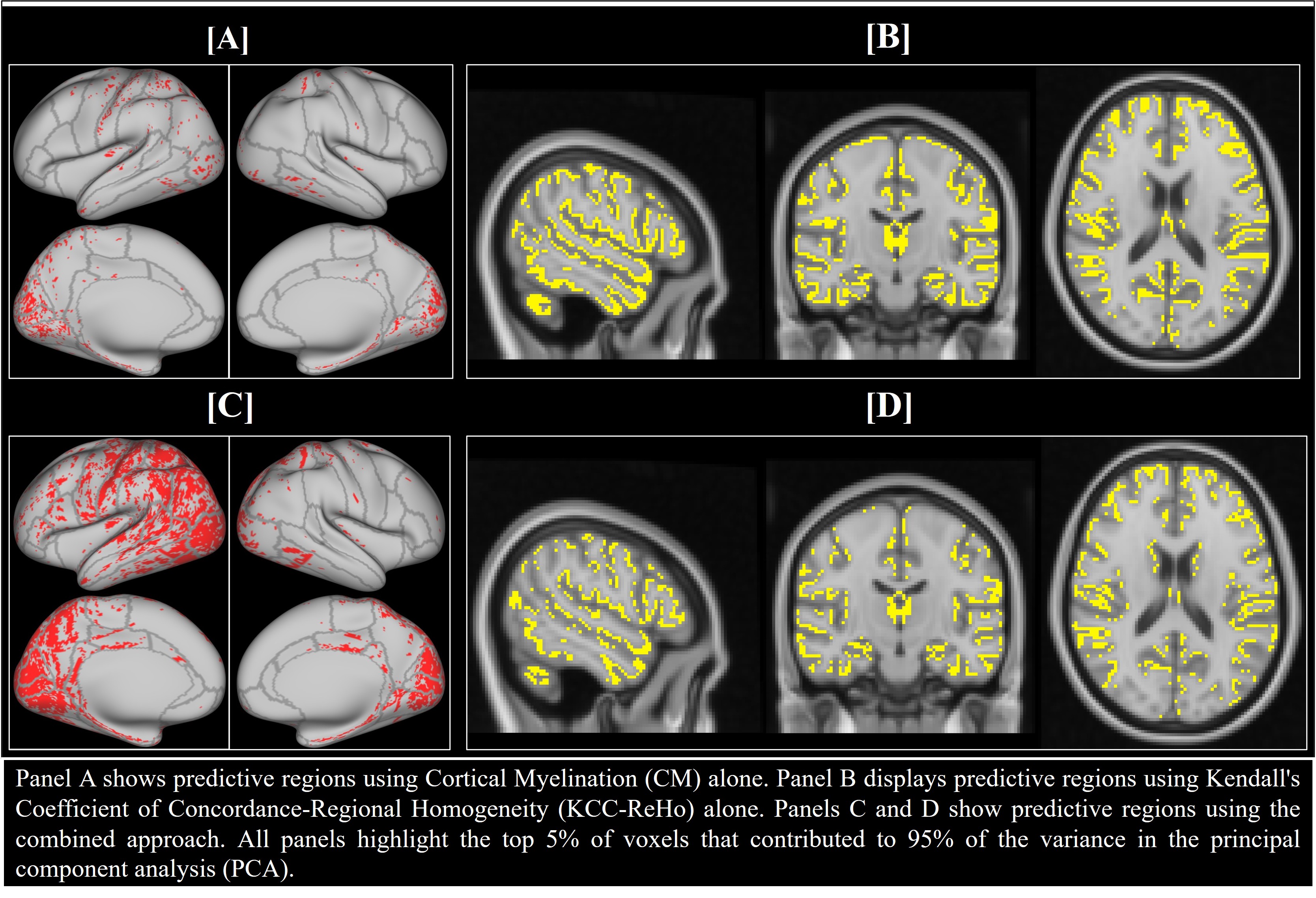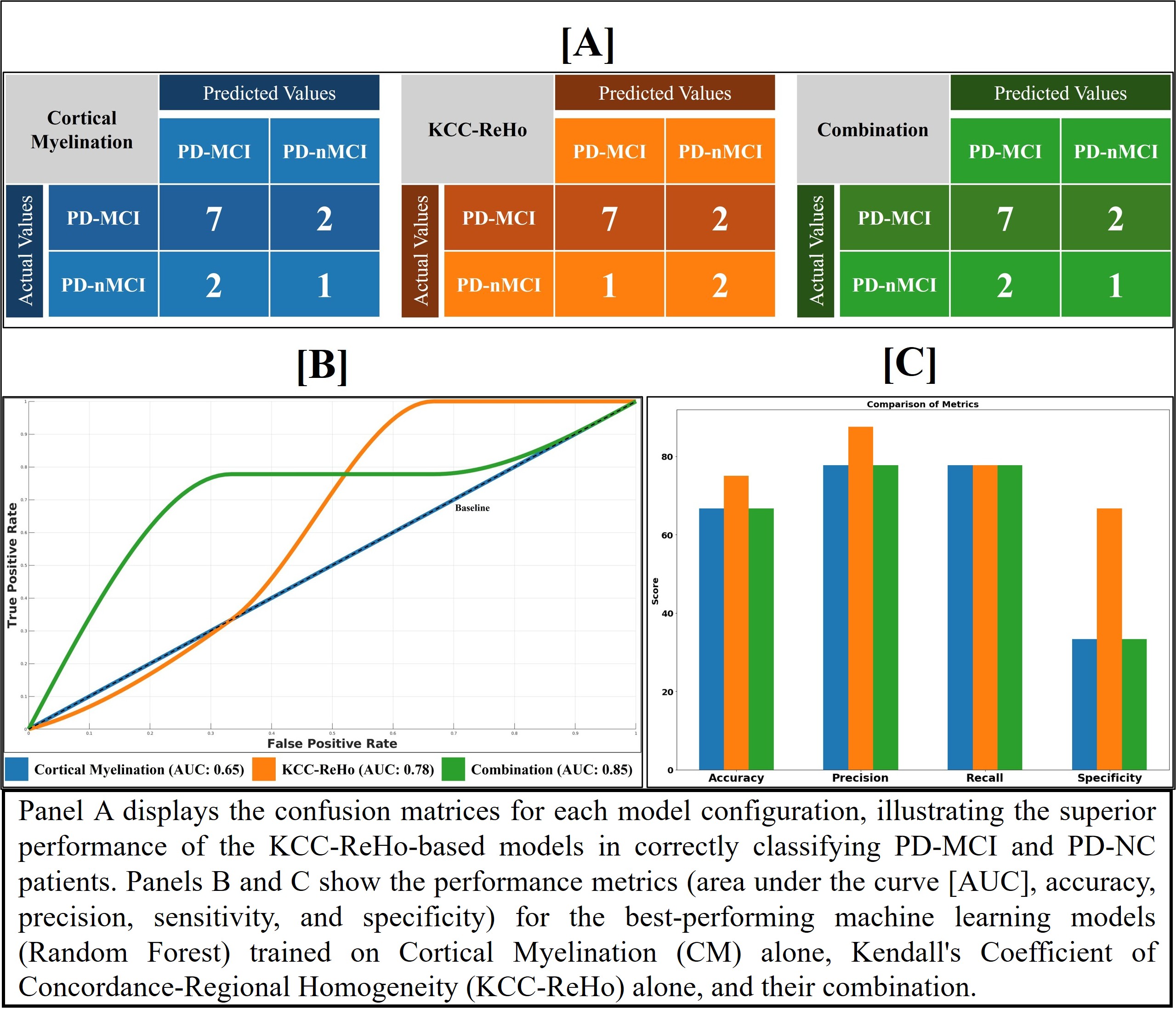 Background: Cognitive deficits, including MCI, often accompany motor impairments in PD [1]. While neuroimaging is commonly used for MCI prediction [1-3], we integrated Cortical Myelination (CM) from T1-weighted/T2-weighted (T1w/T2w) ratios with Kendall’s Coefficient of Concordance-Regional Homogeneity (KCC-ReHo) from resting-state fMRI, hypothesizing their combination would improve PD-MCI prediction accuracy over single-parameter approaches.