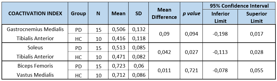 Objective: To compare lower limb muscle coactivation (MC) during gait between Parkinson’s disease (PD) and healthy controls (HC).