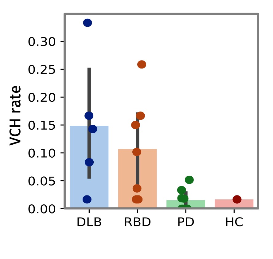 Results: DLB participants exhibited higher mean VCH rates than PD (Cohen’s d = 1.82). RBD participants displayed intermediate rates, with a subset showing scores near zero, resembling PD, and others demonstrating elevated scores similar to DLB [figure1]. Regression analyses linked higher VCH rates to increased occipital and pulvinar activity during VCH events [figure2].