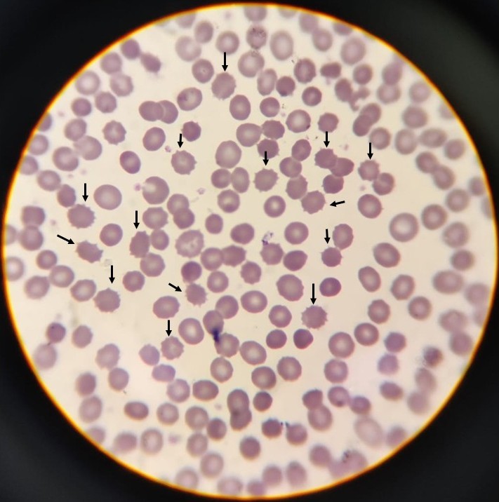 Serum ceruloplasmin and heavy metal levels were normal, and acanthocytes were detected in the peripheral blood smear(Figure 2). Next-generation sequencing (NGS) identified two heterozygous variants in VPS13A: c.3556_3557dup and c.6096-3C>A, the latter being a novel, previously unreported variant.