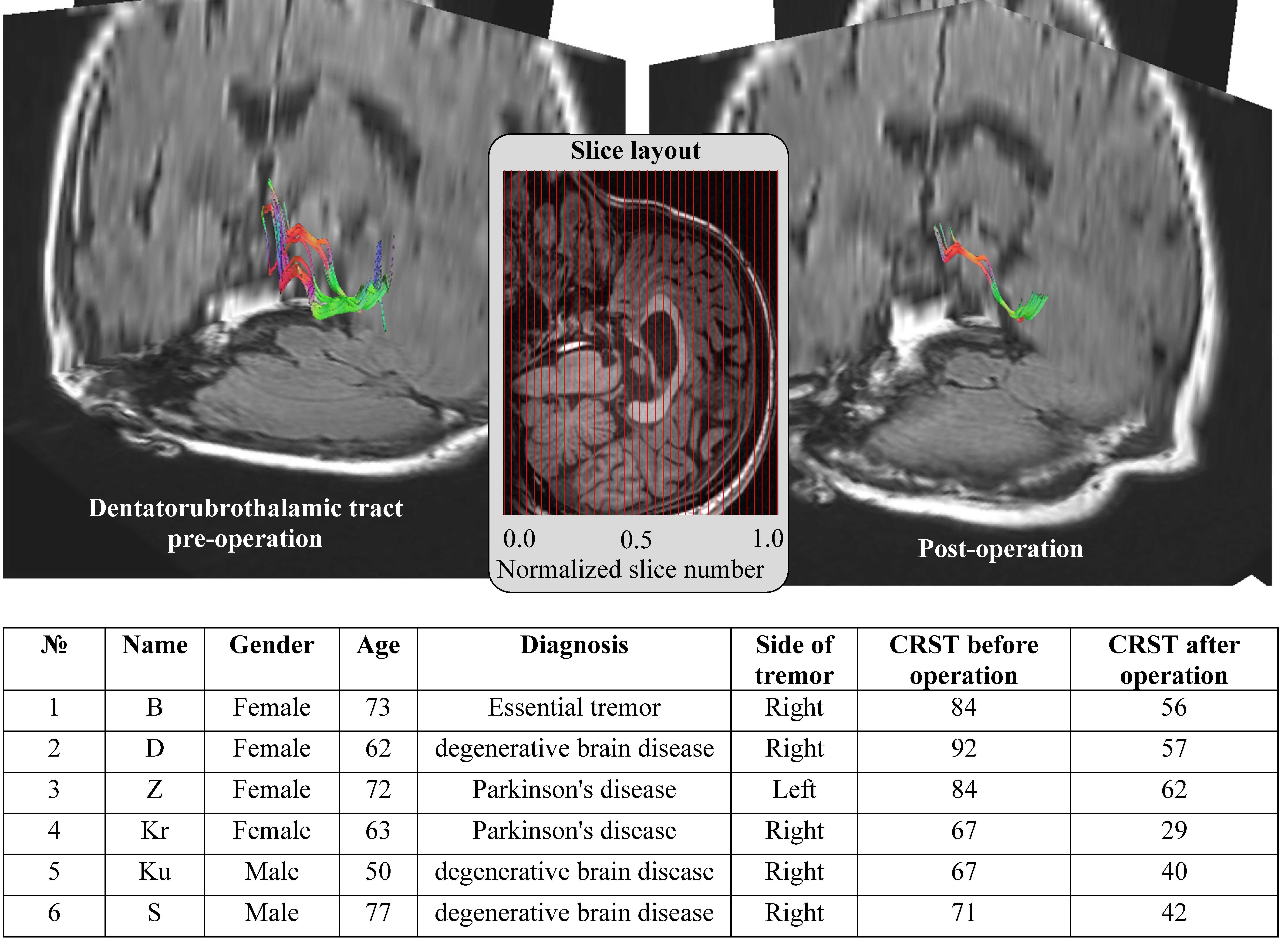 Method: We analyzed treatment results in 6 patients, characteristics are presented in the table, DRT tractography is realized by DSI Studio with RK4 method, 100 million seeds (Fig. 1). Tract density (TD) is calculated, it is summarized over each/all slices. The state of TD distribution disorder is evaluated with Shannon entropy. All patients underwent stereotactic thalamotomy with targeting in DRT at the AC-PC level. Tremor was assessed using a Clinical Rating Scale for Tremor (CRST) in preoperative and postoperative period.