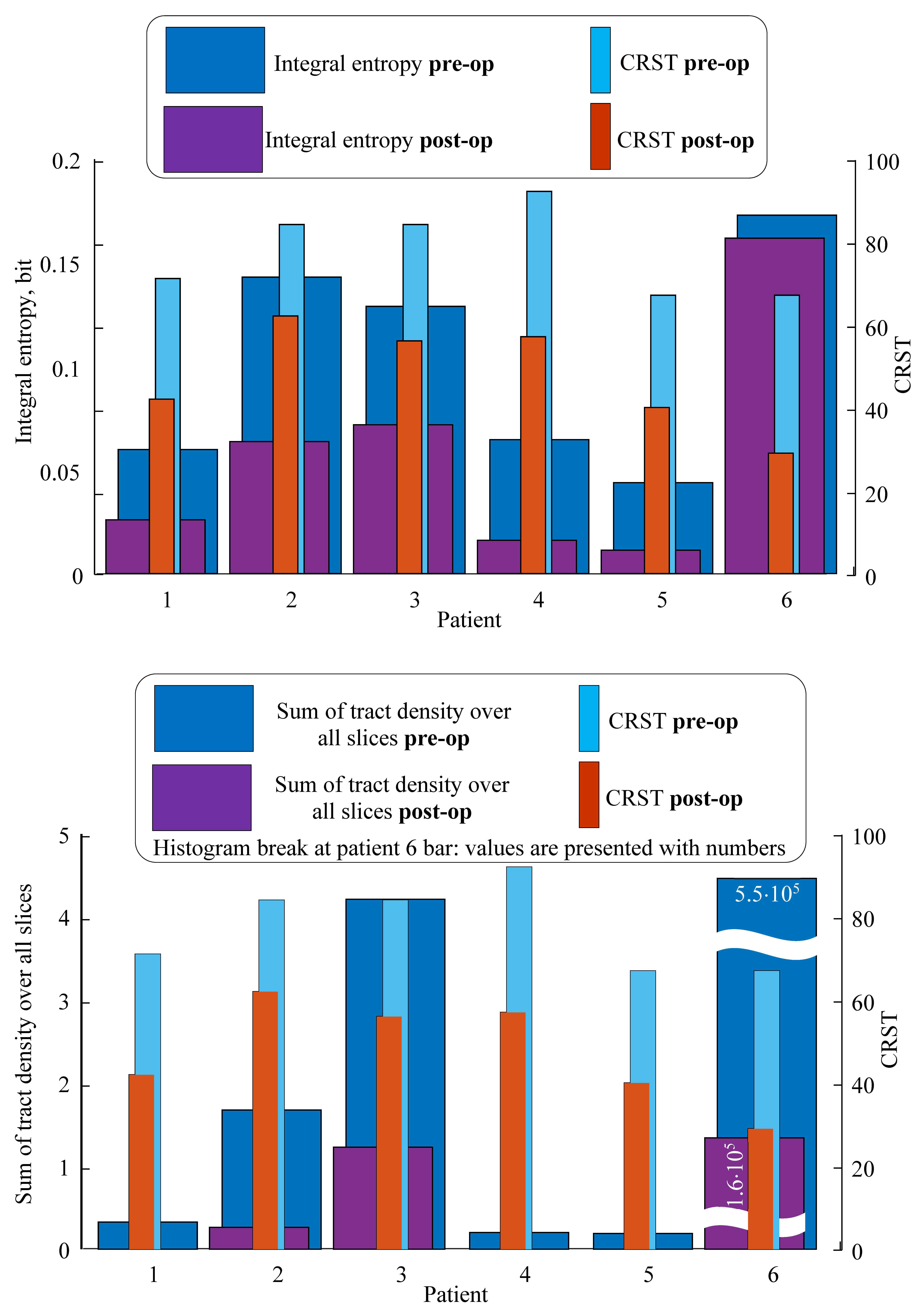 Results: For all cases, TD sum and entropy are both decreased in post-operation state for all slices (Fig. 2). The TD sum decreasing shows the suppression of DRT, low entropy is associated with “more-ordered” TD distribution (in turn, shows the poor DRT re-organization). Sum of TD and its entropy over all slices are decreased for all patients, that correlates with CRST decline (Fig. 3). Significant reduction of tremor was observed in all patients. In one case, patient K had a complication in the form of hemiparesis in the early postoperative period, which completely resolved 1 week after surgery.