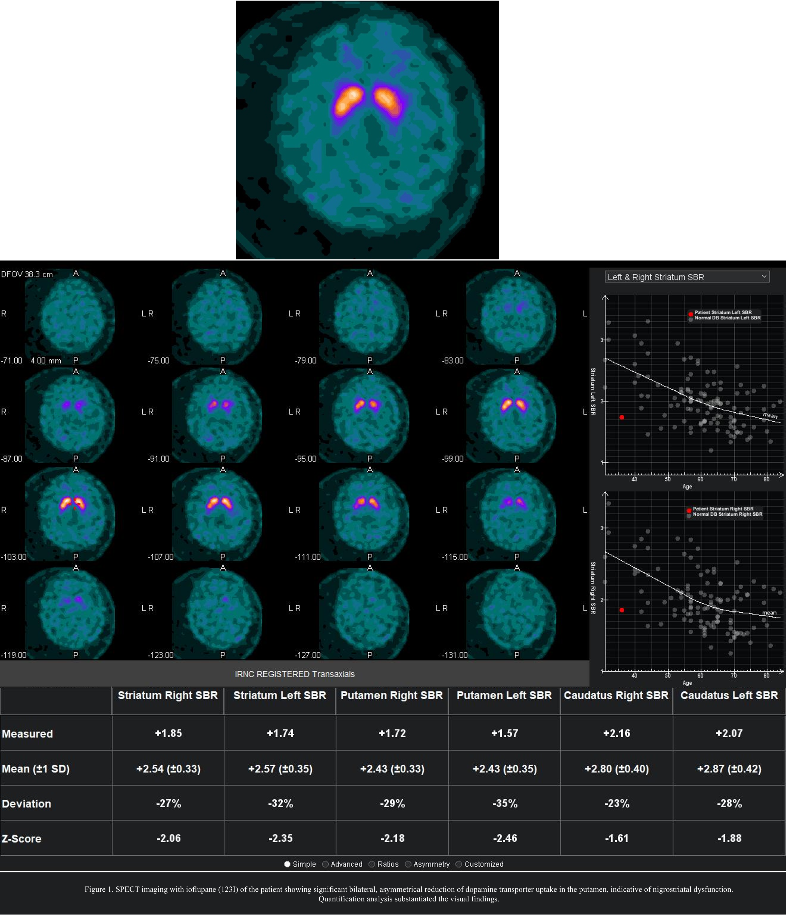 Results: We report the case of a 38-year-old woman with lifelong psychomotor delay, autistic features, intellectual disability and dysmorphic traits. She developed progressive parkinsonism at age 27 while receiving neuroleptic treatment. Clinical evaluation included neurological examination, SPECT imaging with ioflupane (123I), and genetic analysis, including next generation sequencing. Neurological findings revealed hypomimia, hypometric saccades, bradykinesia, rigidity, mild postural tremor, and pyramidal signs. Imaging [figure1] showed bilateral, asymmetrical dopaminergic deficit, suggesting a neurodegenerative component beyond the drug-induced parkinsonism. Whole-exome sequencing identified the heterozygous de novo c.581G>T (p.Gly194Val) variant in the KMT5B gene (NM_017635.4). The variant was absent from population databases, predicted to be deleterious, and classified as pathogenic per ACMG guidelines [5]. The patient’s parkinsonism remained stable despite neuroleptic reduction, and levodopa treatment was not initiated due to patient and family preference.