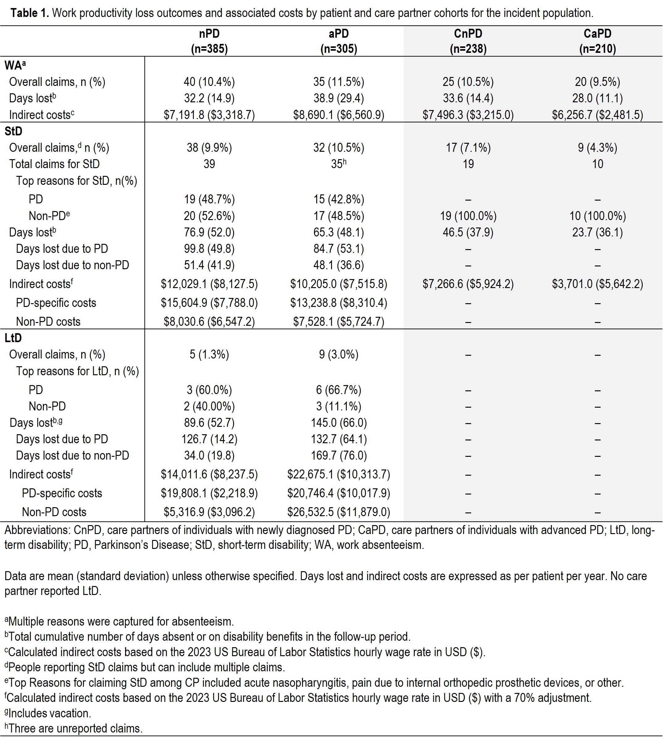 Method: This retrospective, observational cohort study used data from the Merative™ MarketScan® Commercial Claims database linked to Health and Productivity Management (Jan 2017-Dec 2021). Actively employed adults (18-64 y) with worker benefits and a PD diagnosis (Dx, ICD-10 G20.xx) treated with ≥1 PD medication were included and categorized into 2 groups: nPD (incident users of PD treatment) and aPD (prevalent PD, newly initiated on Levodopa Equivalent Daily Dose ≥1000mg over 30 consecutive days). CP were spouses of individuals with nPD (CnPD) or aPD (CaPD), without a PD Dx, and actively employed with worker benefits. Work absenteeism (WA), short-term disability (StD), and long-term disability (LtD) were defined as annual (12-month post-index) and calculated into indirect costs per the 2023 US Bureau of Labor Statistics hourly wage rate.