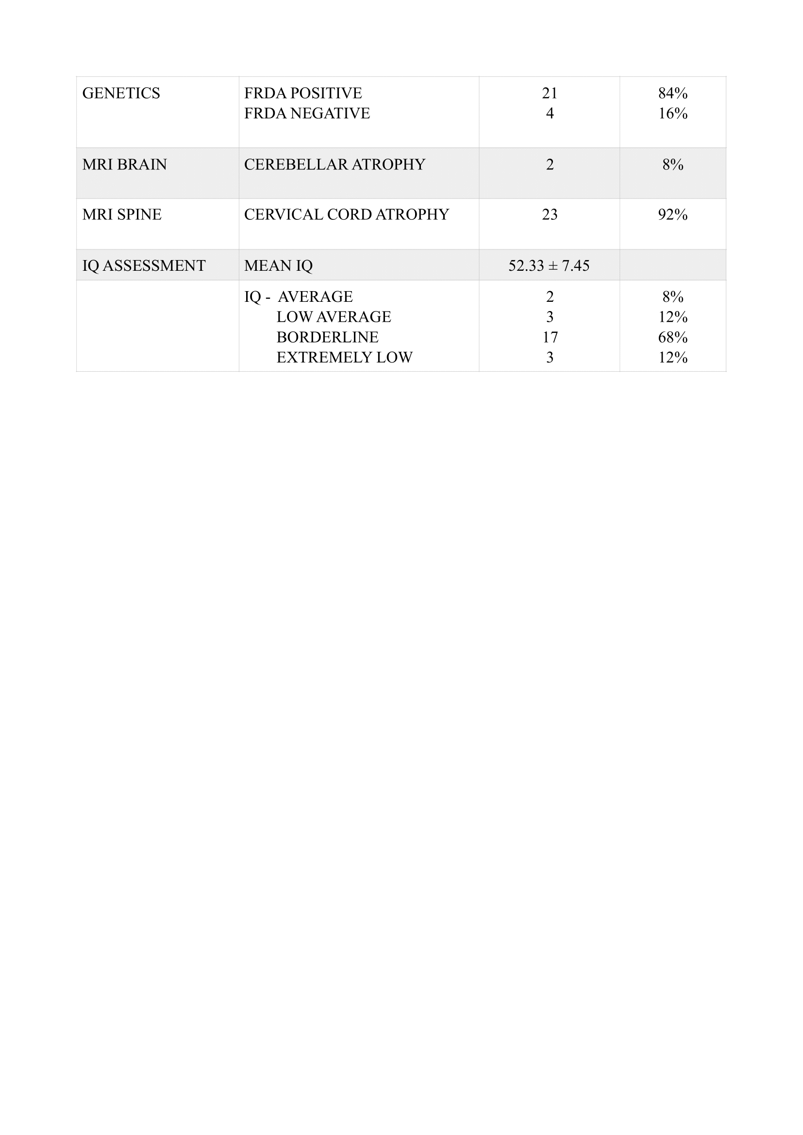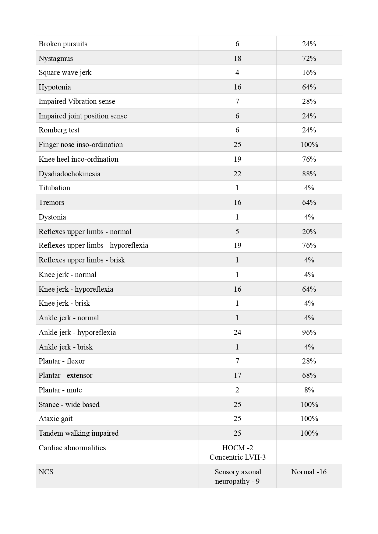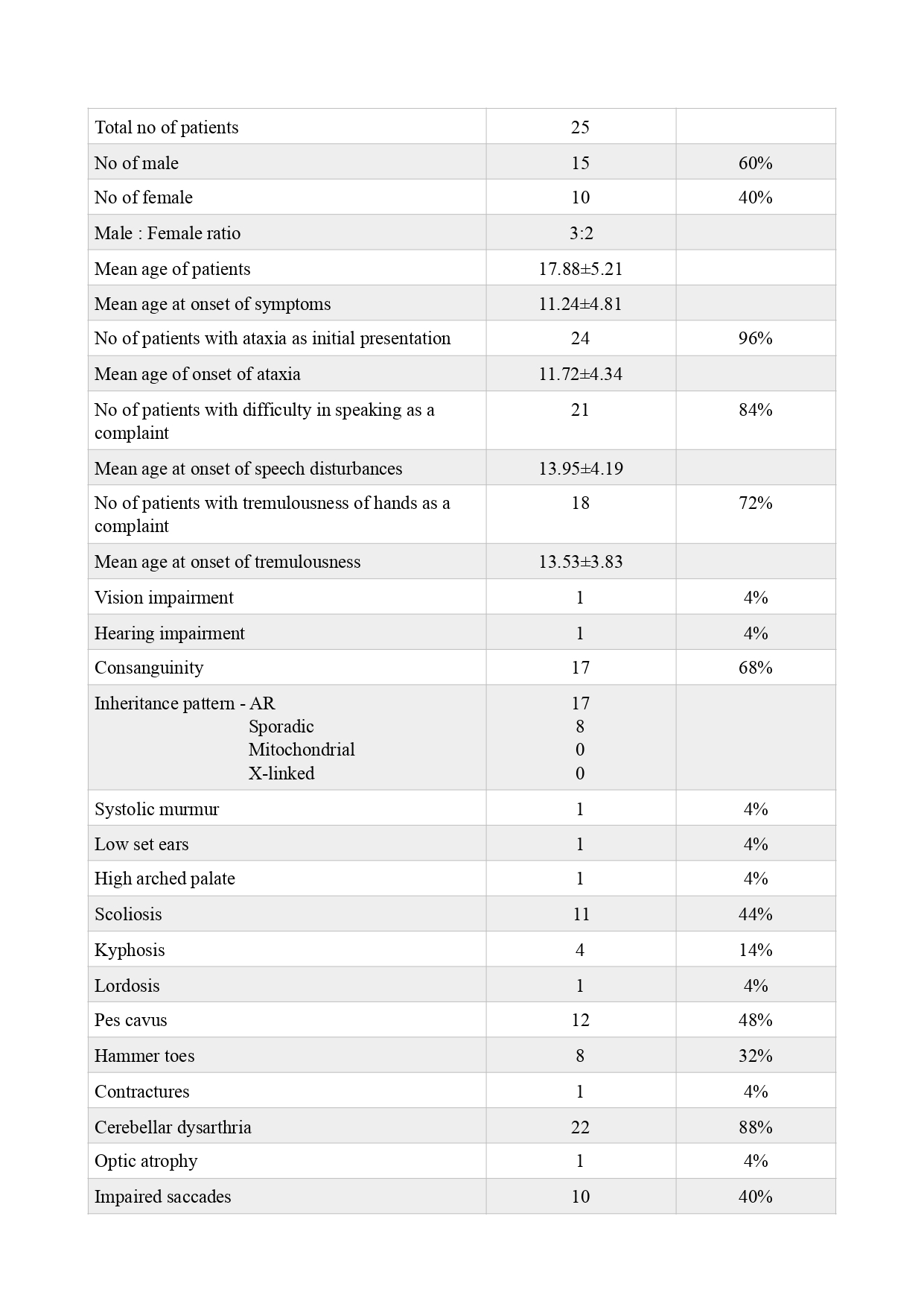 Results: In our study, there were 25 patients with clinical phenotype satisfying Harding’s criteria for Friedreich ataxia. The number of males were 15(60%) and females were 10(40%). The mean age at onset of symptoms was 11 years. Twenty four(96%) patients had gait ataxia at initial presentation. Twenty one patients had reported speech disturbances(84%). Vision impairment and hearing impairment was reported in one patient. Twenty two(88%) patients had cerebellar dysarthria and 4(16%) had square wave jerks. Cardiac abnormality was found in 5 patients. MRI brain showed cervical cord atrophy in 23(92%) and cerebellar atrophy without cord atrophy in 2(8%). FRDA gene was positive in 21(84%) and 4(16%)were negative. The mean IQ score was 52.33 ± 7.45.