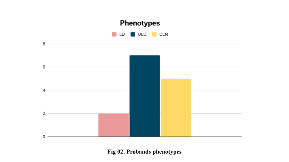 Results: The prevalence was 4/1000000 with a Sex ratio of 1.8. 71.4% of cases had familial history and 64.3% were born from consanguineous marriage. Mean age was 21.9 years (7-45 years old). Mean age of onset was 9.1 years old and 78.6% had onset between 5-15 years old. Generalized tonic clonic seizures were the sign of onset in 40% of cases, 20% reported myoclonus and 20% reported ataxia as the first symptom appearing. From the 14 probands, seven had an Unverricht Lundborg (ULD) phenotype, two had Lafora-like (LD) phenotype and one was confirmed by biopsy pathology and five had Neuronal ceroid lipofuscinosis (CLN) phenotype (Fig. 02).