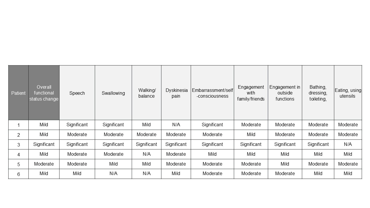 Results: At baseline, all 6 individuals (ages 31-78 years, 4 males, 2 females) were diagnosed with a psychiatric disorder (n=4 schizophrenia, n=2 mood disorder), had previous antipsychotic exposure, and were moderately/significantly impacted in ≥1 functional area. Length of symptoms was 3-5 years for 5 individuals and <1 year for 1 individual; 2 individuals each were reported with mild, moderate, or severe movement symptoms.