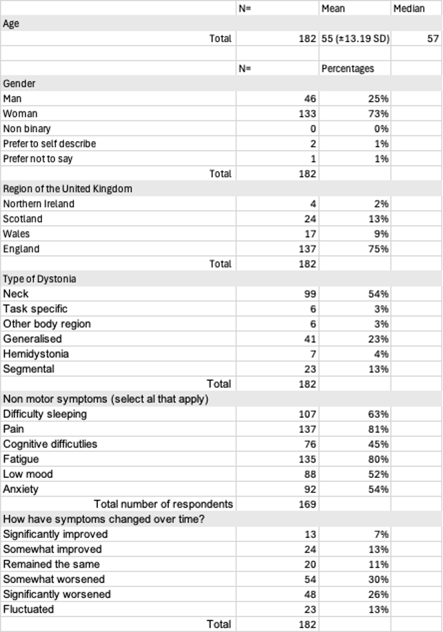 Method: A cross-sectional online survey of UK adults with dystonia was conducted from August 2024-January 2025. The survey was developed by a multidisciplinary team of neurophysiotherapists, neurologists and Dystonia UK patient advocates. The survey was hosted online, with participants invited to take part in the survey via multiple routes that included website and social media posts and emails to distribution lists. Ethical approval was obtained (IRAS project ID 233848).
