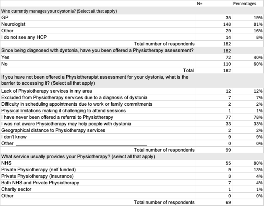 Conclusion: Despite recognition of dystonia as a multi-symptom disorder requiring rehabilitative care, significant gaps exist in UK service provision. Further investigation is needed to understand low referral rates and promote allied health professionals’ role to clinicians and patients. Future research should examine how physiotherapy service provision varies between countries to understand its impact on patient outcomes.