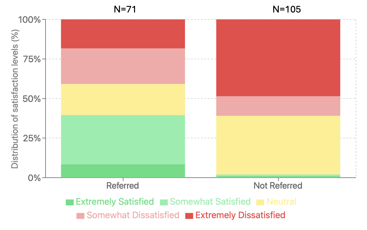 Results: From 182 responses across the UK, 60% of participants reported not being offered physiotherapy following diagnosis. While 78% of participants considered physiotherapy access important, 59% of those unsure cited insufficient information about benefits. Referral to physiotherapy was significantly associated with higher satisfaction levels of access (Figure 1, group comparison of satisfaction rating: Mann-Whitney U=2130.50, p<0.0001). Significant non-motor symptoms such as anxiety, fatigue, and pain were also often unaddressed within standard clinical care.