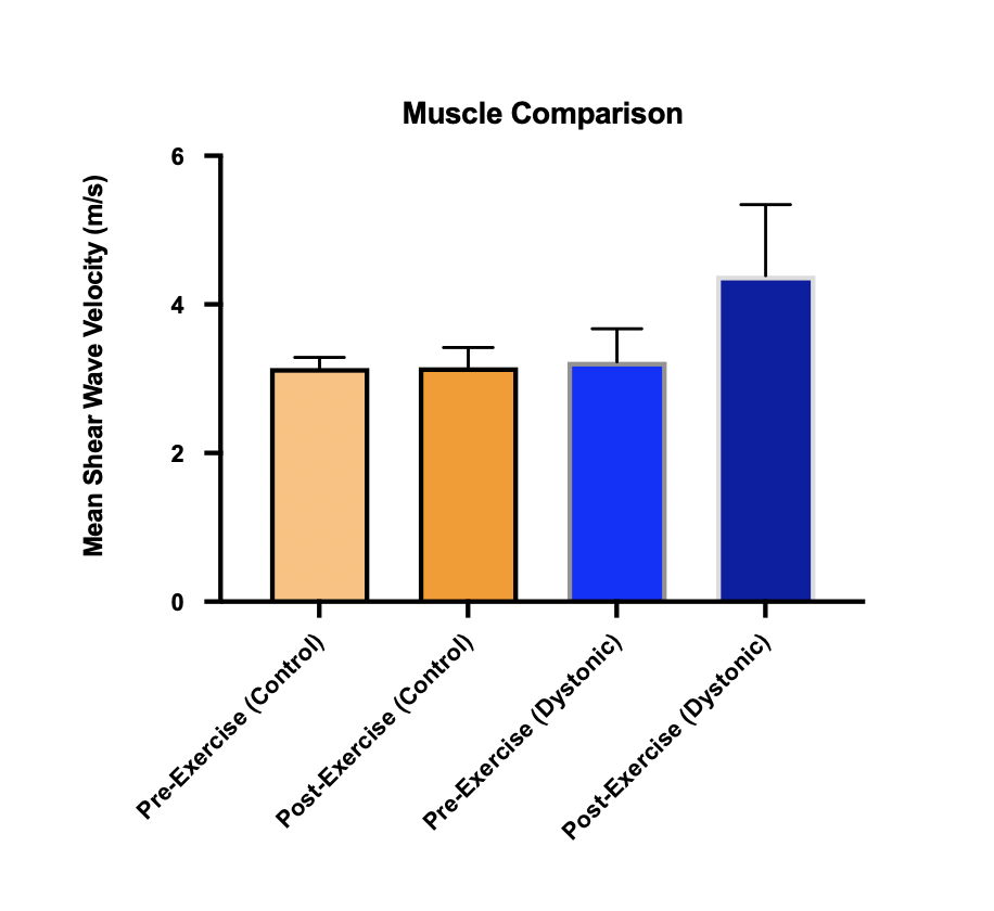 Method: We enrolled 8 participants with adult-onset, TSD, involving lower limb muscles, who were either toxin-naïve or >12 weeks post-injection. Participants were evaluated by our team to select a primary dystonic muscle based on affected limb’s phenomenology. For comparison, a contralateral control muscle was selected. SWE was collected pre-exercise (after 15 minutes of rest) and immediately post-exercise (dystonic symptoms for three minutes). Mean stiffness, represented by shear wave velocity (m/s), was calculated from six SWE measures captured per muscle. A Student’s t-test was used for comparisons.