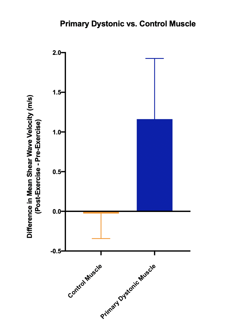 Results: Stiffness increased 36% pre-to-post-exercise in the primary dystonic muscles (paired t-test, p=0.0036) while there was no change in stiffness in the control muscles (paired t-test, p=0.9485). The dystonic muscle demonstrated 15400% greater change in stiffness pre-to-post exercise, relative to the control muscle (2-sample t-test p=0.0015).