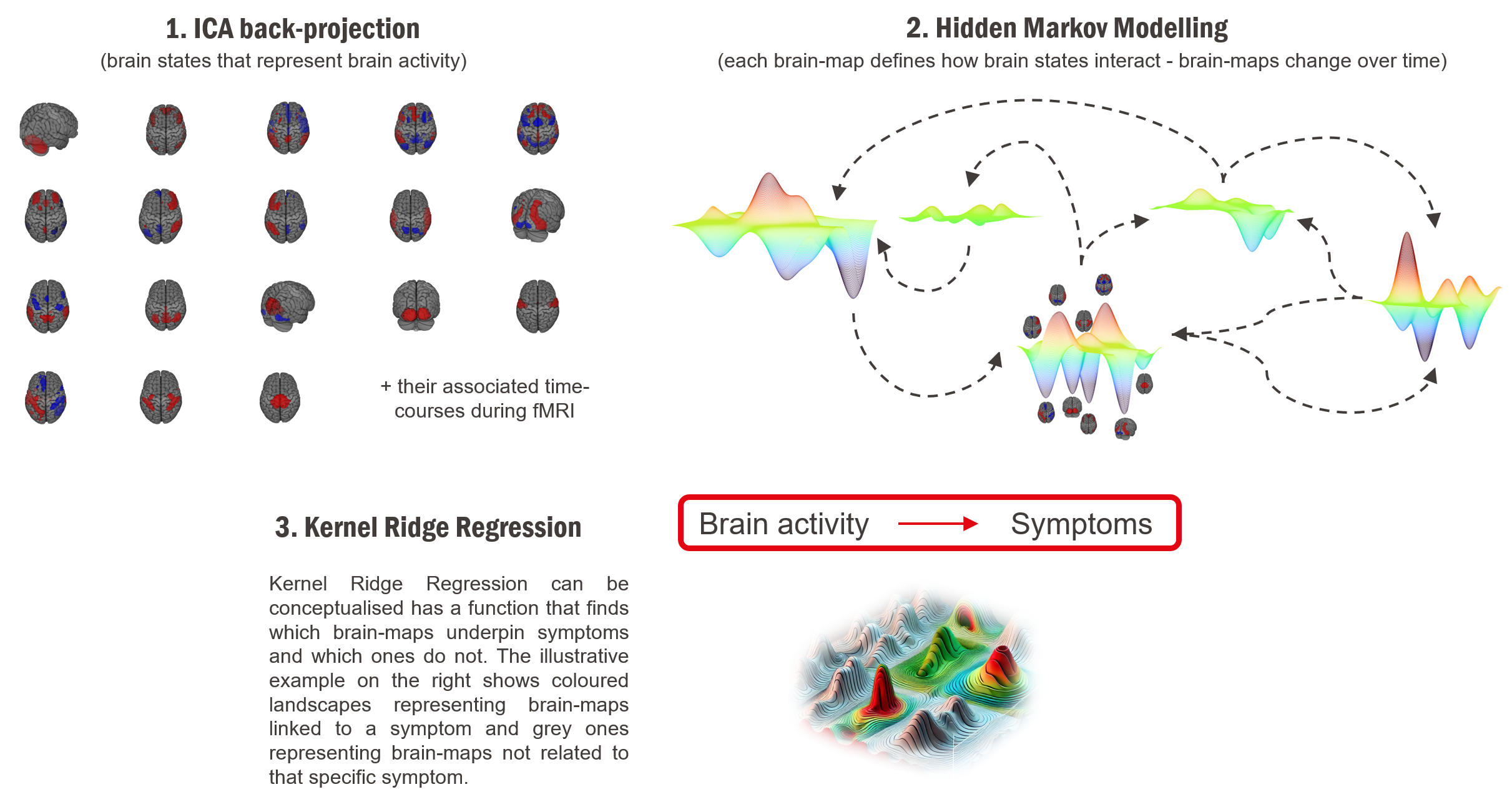 Method: 51 PD patients without dementia but with a varied clinical phenotype performed a battery of neuropsychological and neurological assessments, fMRI, and a sensorimotor robotic task to induce clinically relevant hallucinations [3]. We recovered brain activity from fMRI using ICA back-projection and created probabilistic representations of each patient’s brain-state dynamics using Bayesian methods (Hidden Markov Modelling) [4]. To predict each patient’s symptoms solely from these representations we resorted to Kernel Ridge Regression [5].