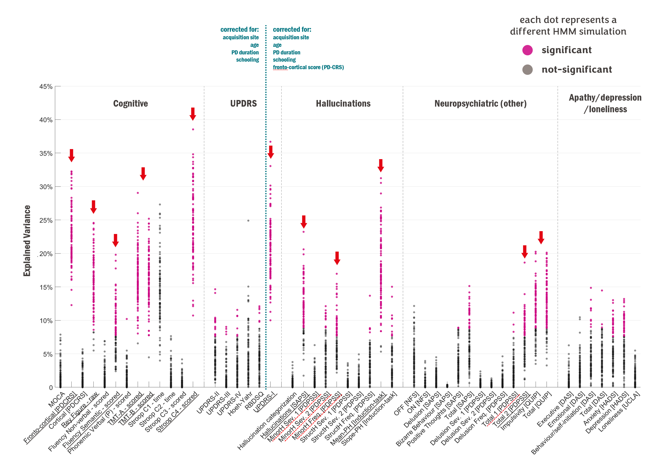 Results: Our models excel at predicting executive functioning, mental flexibility and interference-inhibition, lexical retrieval and production, as well as visuo-constructional ability and memory. Regarding hallucinations, questionnaires that captured their frequency and severity were well predicted, however, the models could not predict stratifications into structured-visual, minor or no hallucinations, suggesting that such approach does not sufficiently reflect the underlying changes in neural dynamics. Crucially, the sensitivity to an hallucination-inducing robotic task – previously linked to proneness to clinical hallucinations [6] – is significantly well predicted. In addition, non-motor experiences (MDS-UPDRS-I) and impulsivity are also well predicted. Finally, our models show the clinician’s assessment of neuropsychiatric symptoms to be more reflective of neural changes than the patient’s subjective assessment.