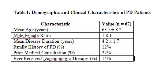 Out of 2,500 individuals screened (aged ≥50 years), 67 cases of PD were identified, yielding a prevalence of 2.68%. The mean age at diagnosis was 63.5 ± 8.2 years, with a male predominance (M:F = 1.8:1). Tremor was the most common initial symptom (81%), followed by bradykinesia (74%) and rigidity (59%). Non-motor symptoms, including sleep disturbances (68%) and constipation (54%), were frequently reported but often overlooked. Only 22% of patients had prior medical consultation for their symptoms, and 78% had never received dopaminergic therapy due to limited access and awareness.