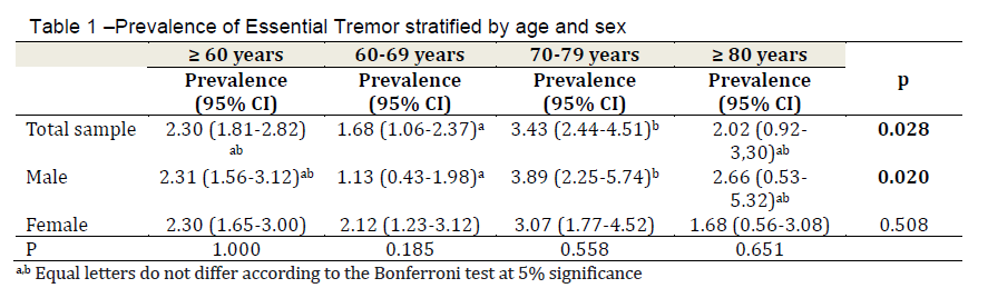 Conclusion: Our findings indicate that the prevalence of ET in Southern Brazil is lower than that reported in a similar study in another region of Brazil. However, this is consistent with findings from other studies globally involving elderly populations, highlighting the importance of early diagnosis and appropriate management of the disorder to improve the quality of life of patients.