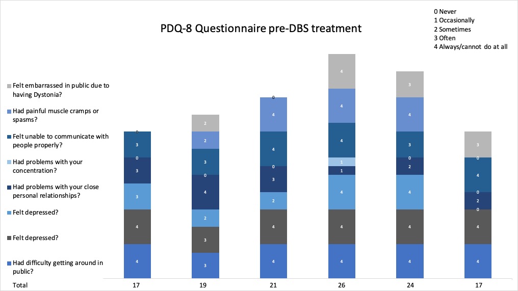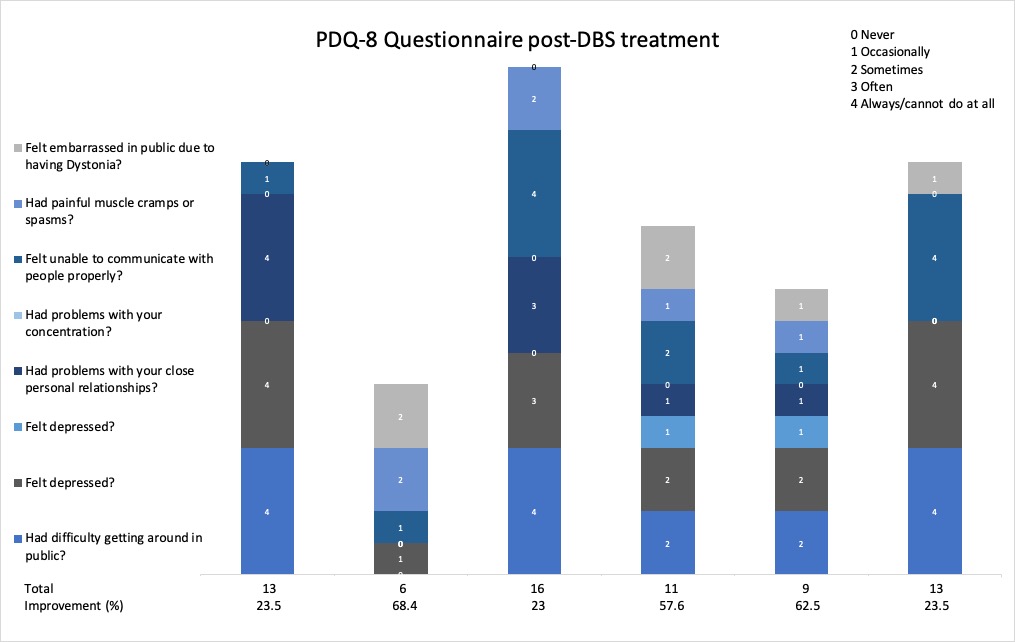 Method: 6 selected patients with generalized dystonia resistant to conservative treatment who underwent DBS surgery and QoL measure with a modified Parkinson’s Disease Questionnaire-8 (PDQ-8), pre and post-surgery.