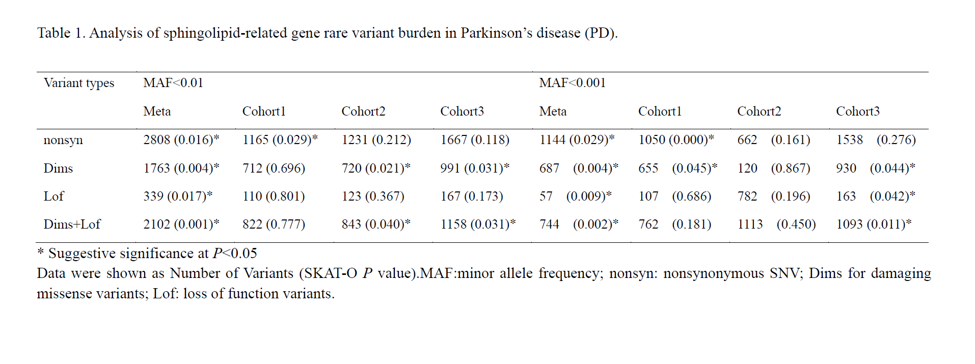 Method: We analyzed the association between rare variants in 62 sphingolipid-related genes and PD using data from 6,697 PD patients and 4,426 controls from the Parkinson’s Disease & Movement Disorders Multicenter Database and Collaborative Network in China (PD-MDCNC)[2]. Next-generation sequencing identified rare variants (MAF <0.01 and <0.001), assessed via the SKAT-O test[3].