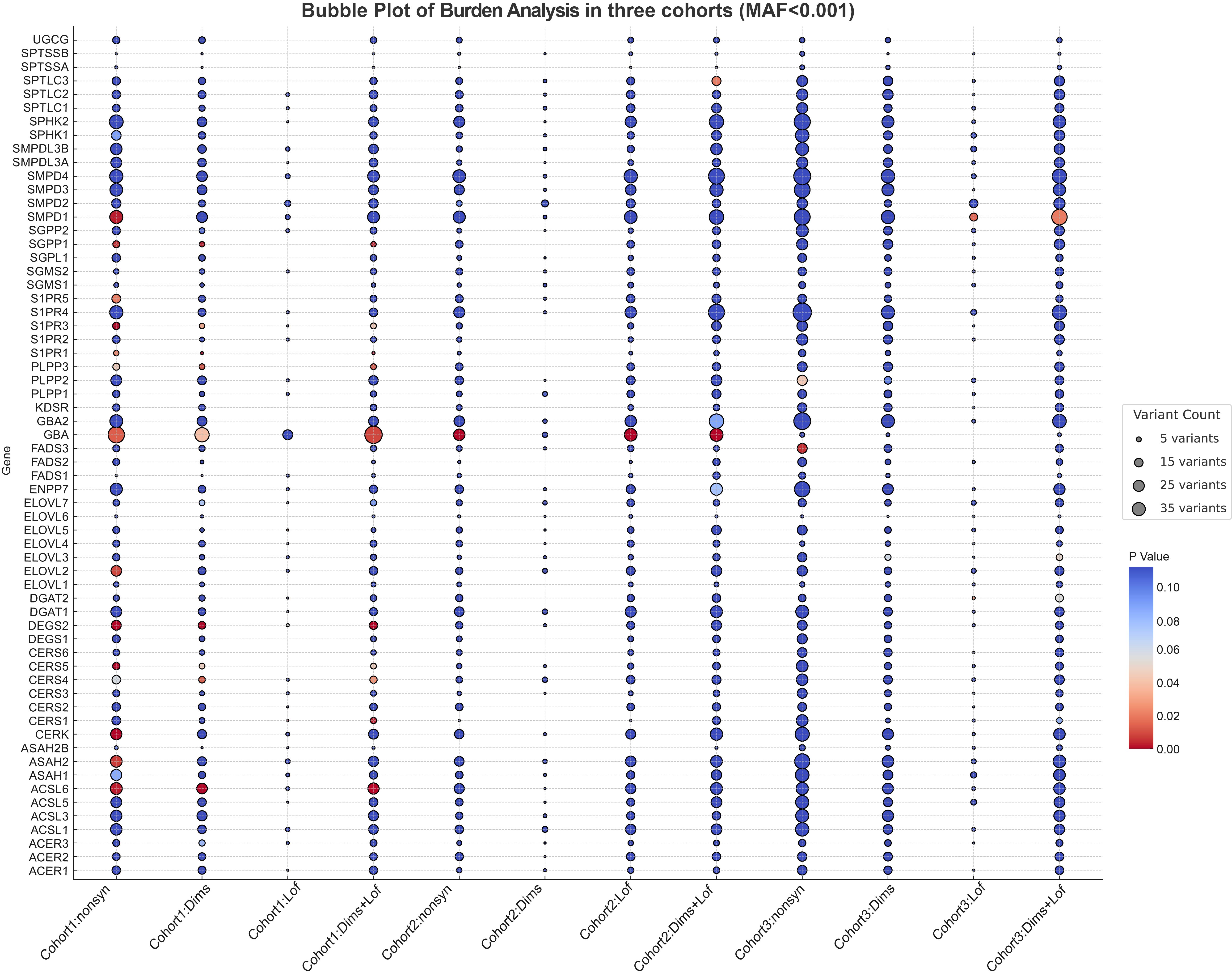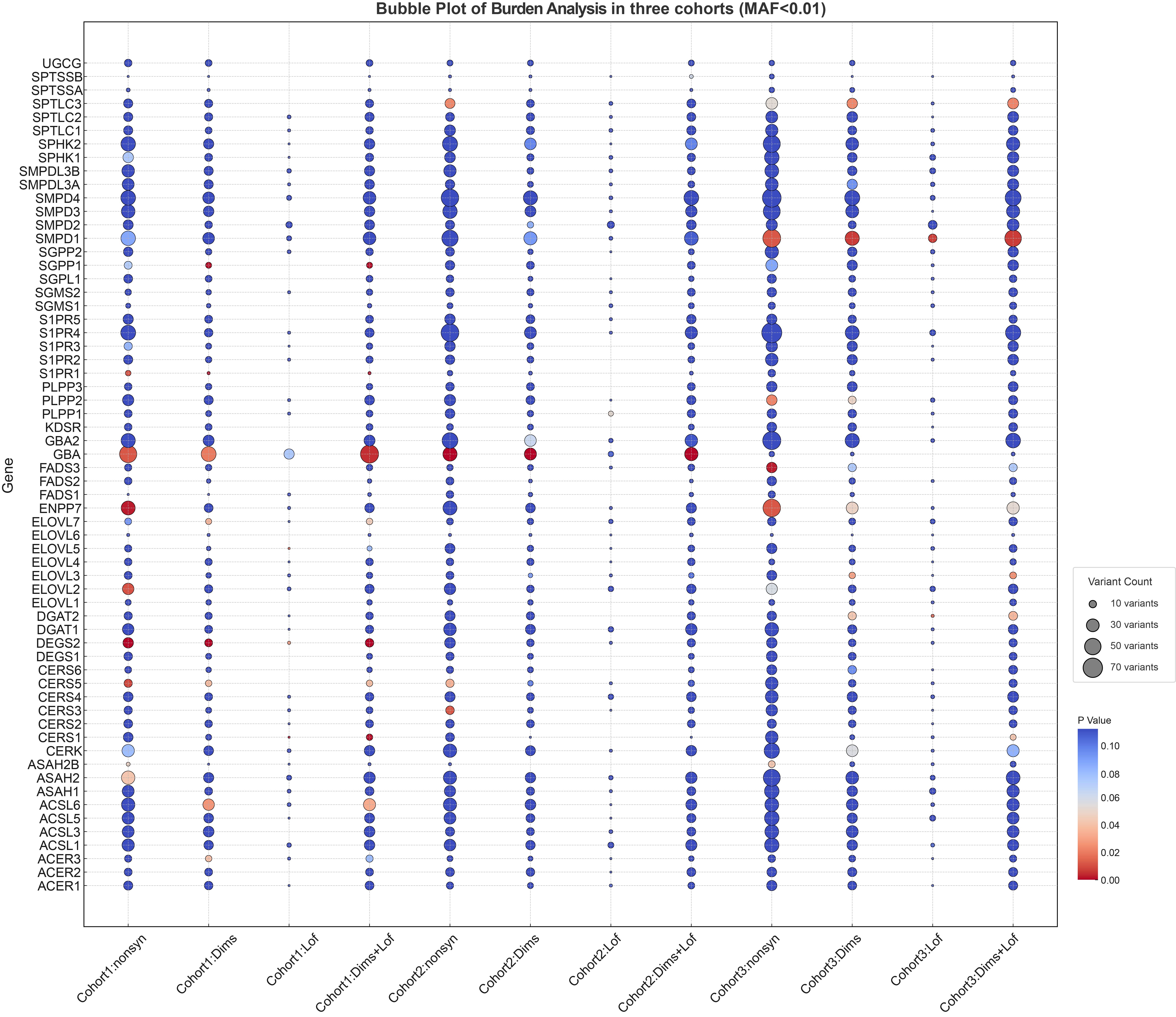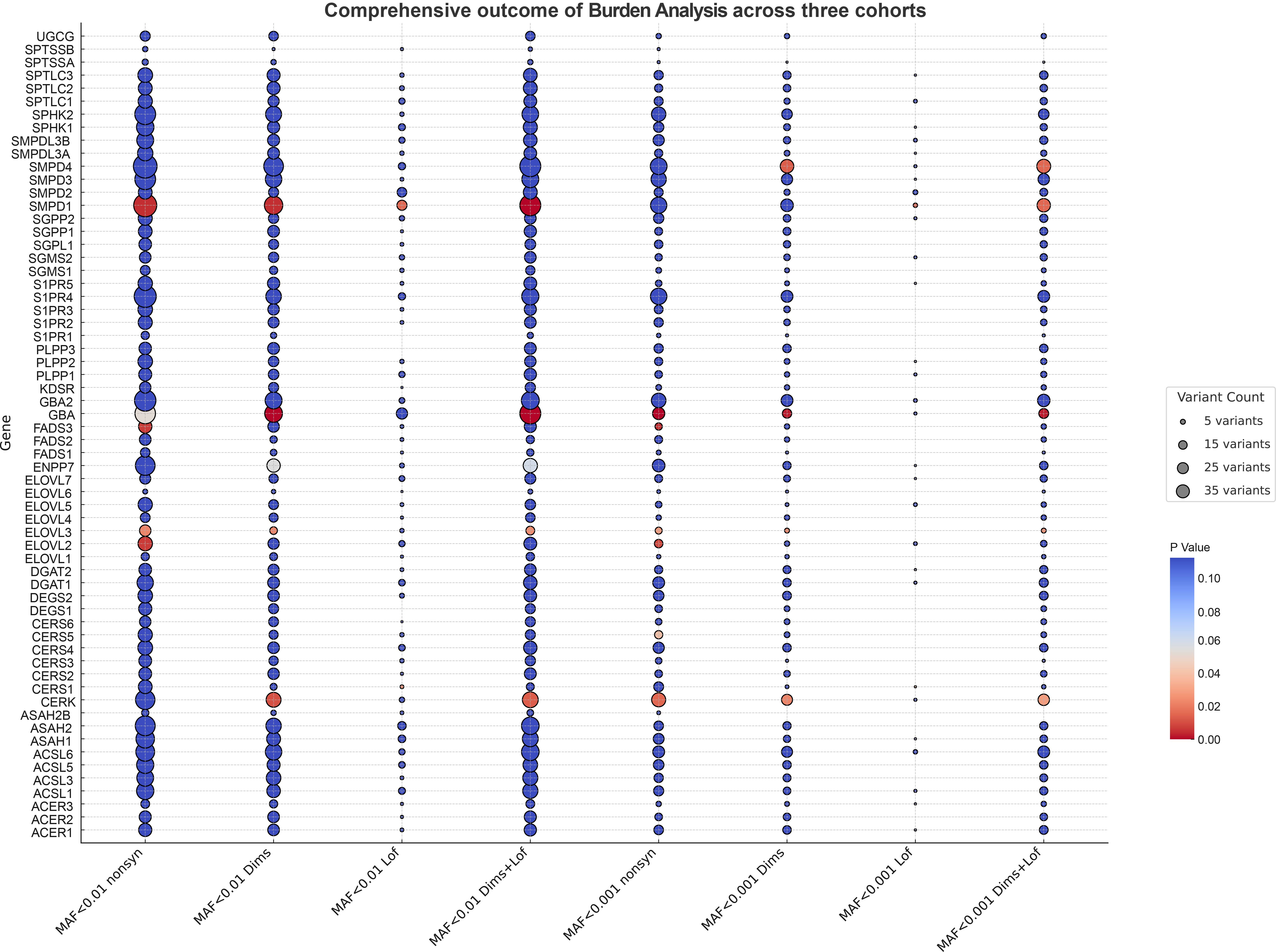 Results: We identified 3,147 rare variants (MAF <0.01). A significant burden of these variants in sphingolipid-related genes was observed in PD patients (p < 0.05, Table 1). In addition to GBA, several genes—including SMPD1, CERK, CERS1, DGAT1, ELOVL2, ELOVL3, ENPP7, and FADS3—showed suggestive associations with PD (MAF <0.01, Figure 1 and Figure 2). With MAF <0.001, SMPD1, CERK, CERS1, CERS5, DGAT2, ELOVL3, ELOVL5, FADS3, and SMPD4 were also suggestively linked to PD (Figure 1 and Figure 3).