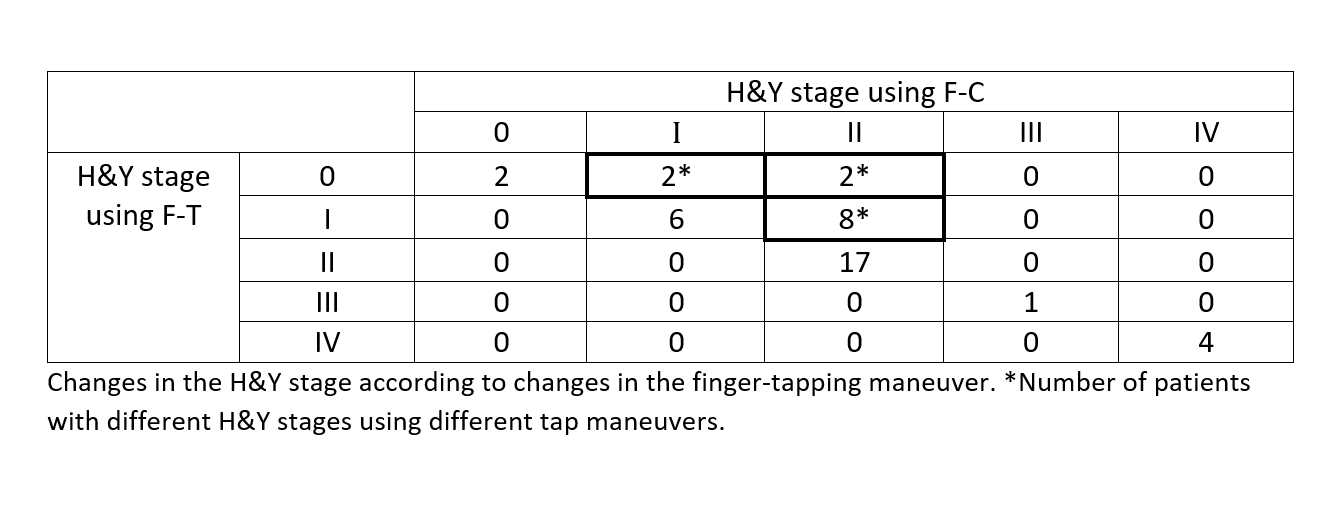 Method: We compared the two methods of detecting bradykinesia in 42 Parkinson’s disease patients. We examined our patients using the bradykinesia subscale of the Unified Parkinson Disease Rating Scale (UPDRS) and the Hoehn and Yahr (H&Y) scales with the two methods of the finger-tapping test. To assess the interrater reliability of the test, a different pool of patients was used, in which four movement disorder specialists evaluated videos of 29 patients performing the finger-tapping test using the two methods with each hand.