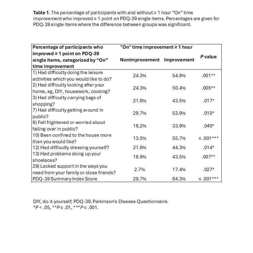 Results: Results: Participants with improvement in their amount of “On” time (N = 115 / 153) were significantly more likely to have ≥ 1 point improvement on the MDS-UPDRS-I single item of fatigue (41.7% vs 21.1%, P = .022), on numerous PDQ‑39 single items (Table 1), and total PDQ‑39 summary index score (64.3% vs 29.7%, P ≤ .001) than those without “On” time improvement. Further, participants with “On” time improvement compared to those without had numerically greater improvement in MDS‑UPDRS-I total score (least square [LS] mean ‑2.26 vs ‑0.54, P = .065) and significantly greater improvement in PDQ‑39 total score (LS mean ‑9.67 vs 0.32, P ≤ .001). Participants with an improvement of ≥ 2.64 points on MDS‑UPDRS-I score, compared to those without, were significantly more likely to experience ≥ 4.72 points improvement on PDQ‑39 total score (72.2% versus 53.7%, P = .006).