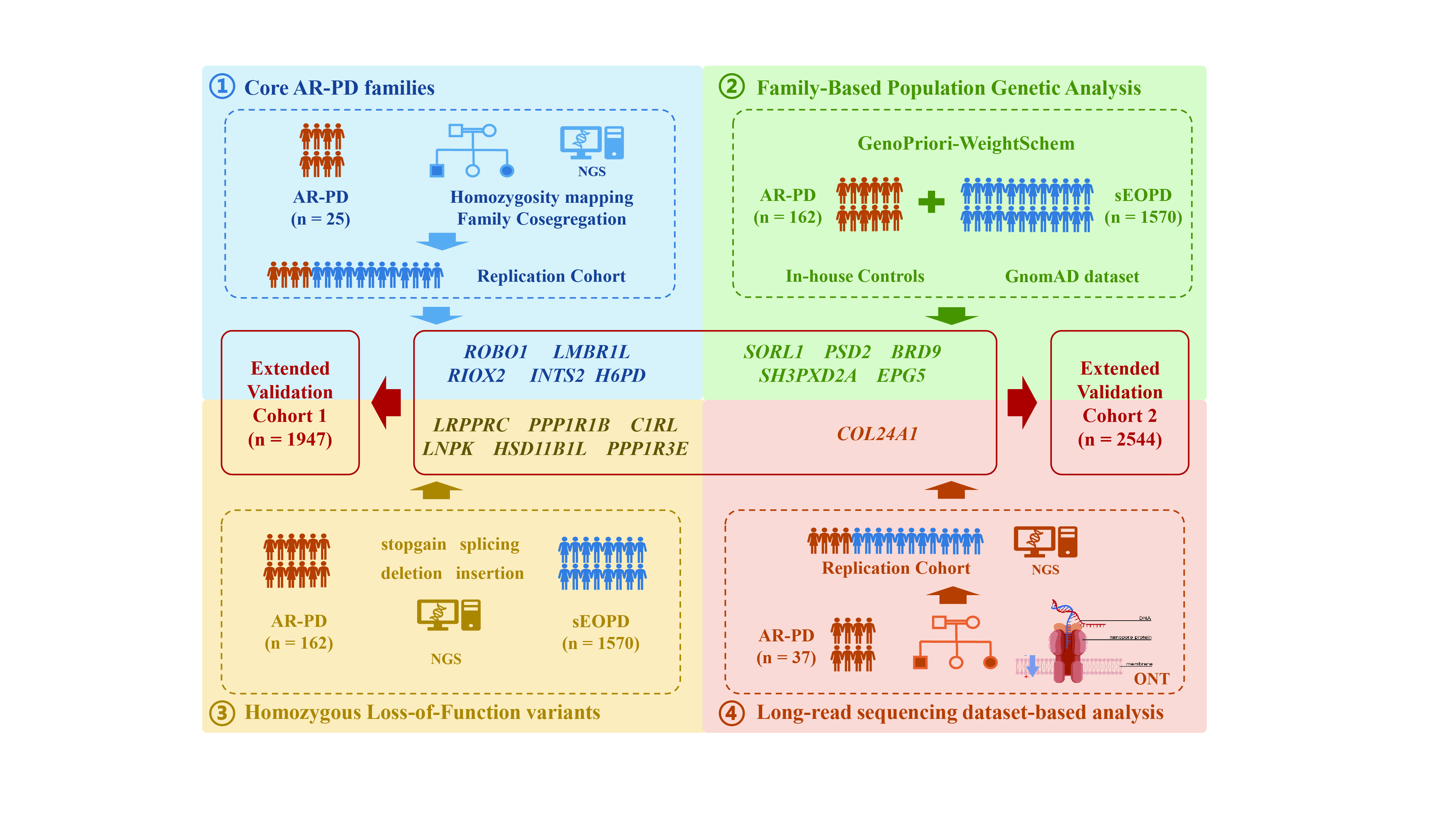 Method: Methods: We studied 162 AR-PD families and 1,570 sporadic early-onset PD patients, combining homozygous mapping and whole-exome sequencing (WES) to identify candidates. Utilizing the GenoPriori-WeightSchem approach, we conducted population-based prioritization of candidate genes. Then, we prioritized biallelic loss-of-function variants for prominence in the candidate gene pool. LRS dataset were analyzed to investigate genes with complex variants. The identified candidates were further validated in 3,947 PD cases with whole-genome sequencing (WGS).