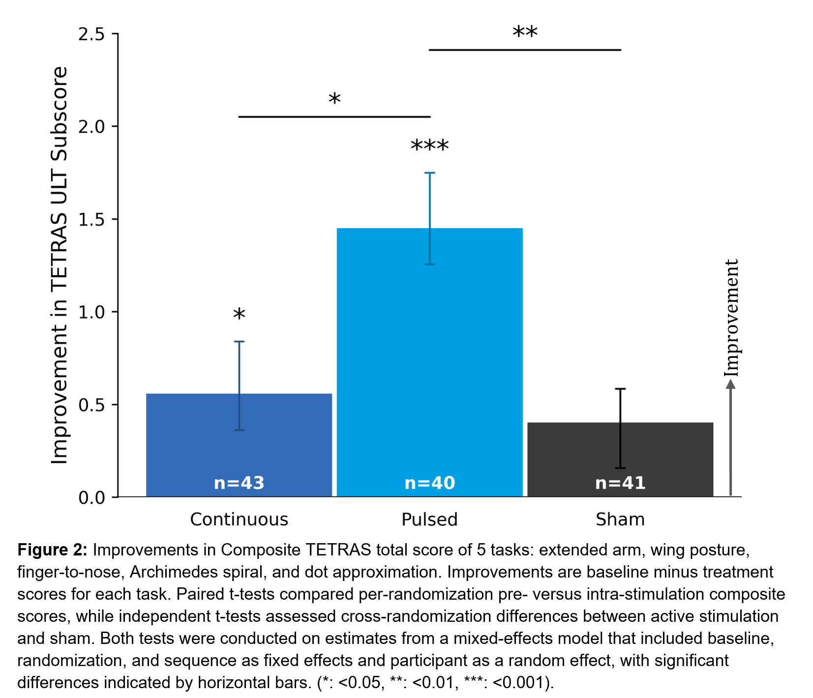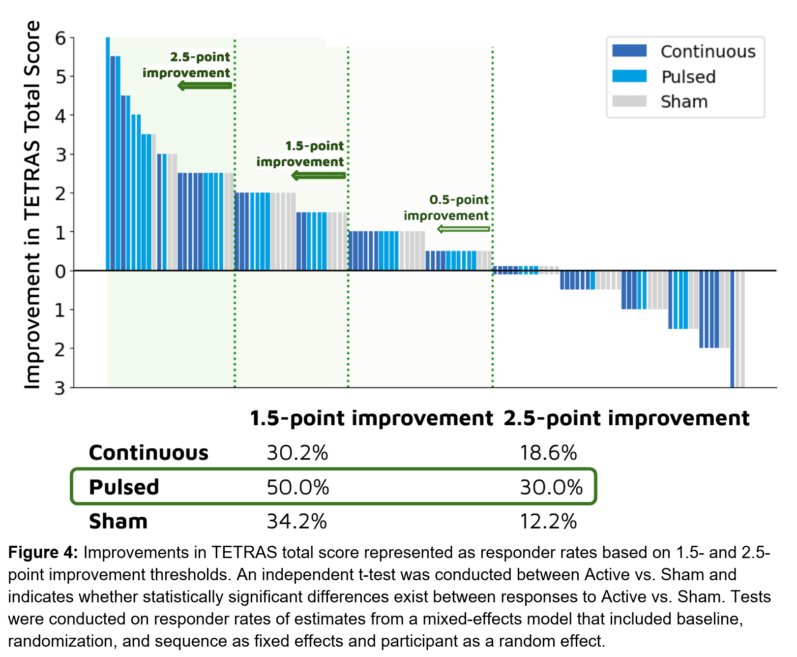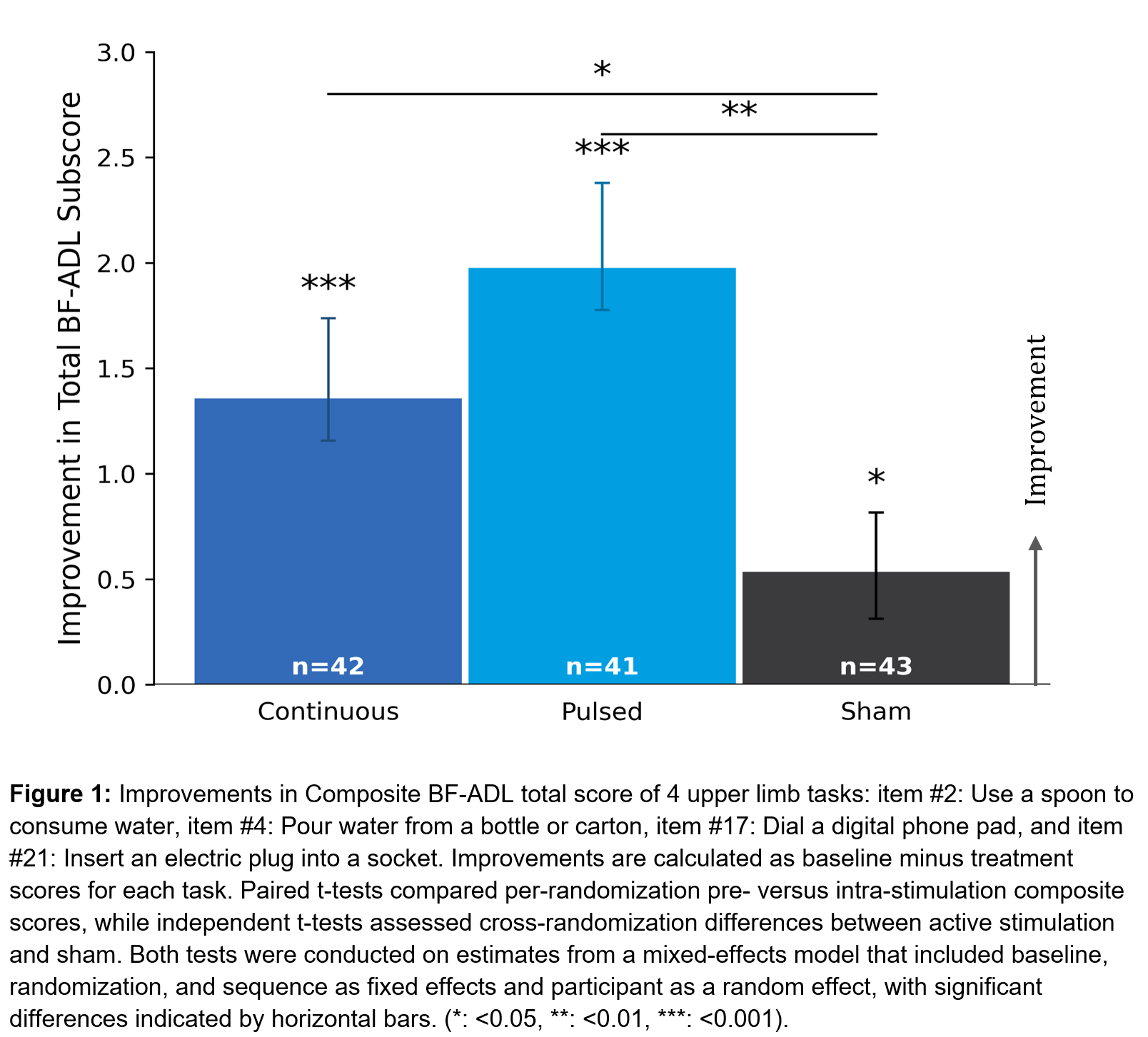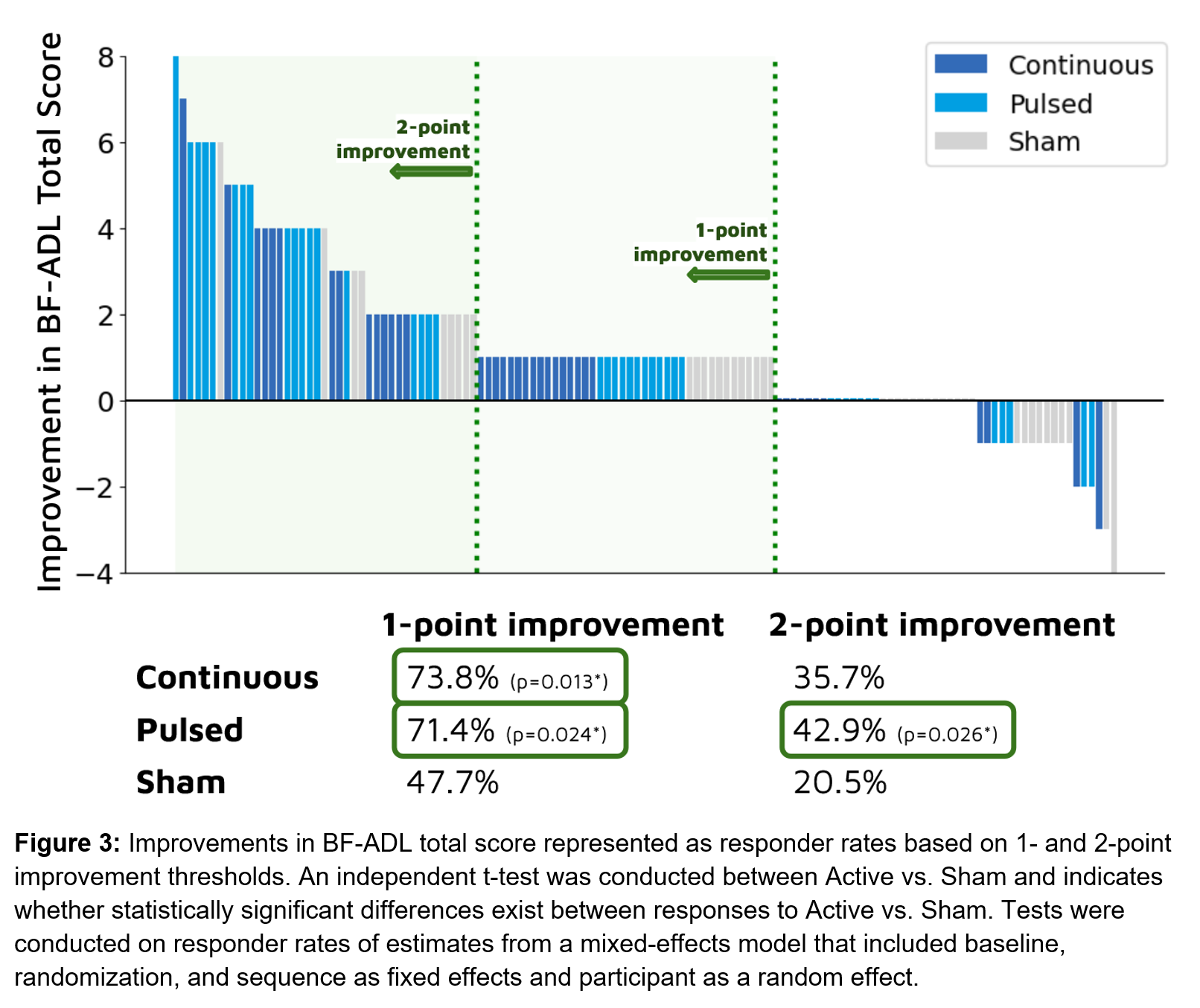 Results: 95% of the 47 randomized participants rated the stimulator as comfortable, and only 11% reported mild/moderate, non-serious, and self-resolving adverse events (AEs). Active stimulation produced significant BF-ADL improvements (Pulsed: 1.93±0.56; Continuous: 1.32±0.57) [Figure 1]. AP significantly outperformed Sham in BF-ADL and TETRAS (p<0.01), but AC outperformed Sham in BF-ADL only (p<0.05) [Figure 2]. For a ≥1-point improvement in BF-ADL, participants were nearly twice as likely to improve with AP (71%) or AC (74%) as with Sham (48%) (p<0.05) [Figure 3]. TETRAS responder rate for ≥1.5-points was higher with AP (50%) vs. Sham (34%) but the difference was not statistically significant (p=0.15) [Figure 4]. Participants’ perception of vibratory stimulation did not predict improvement.