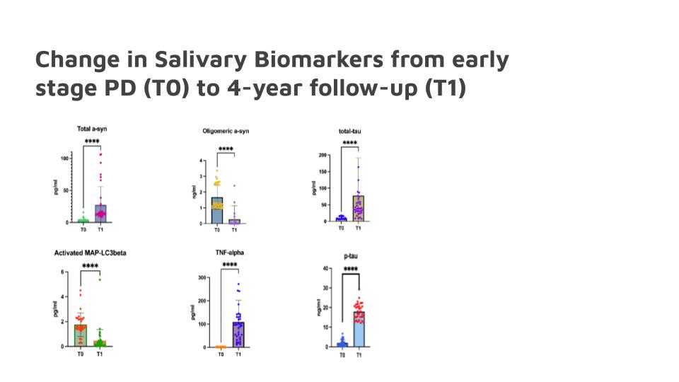 Objective: Investigate longitudinal changes in salivary levels of oligomeric and total a-synuclein (a-syn), phosphorylated-tau (p-tau), total tau, MAP-LC3, and TNFa in Parkinson’s Disease (PD) patients