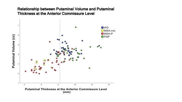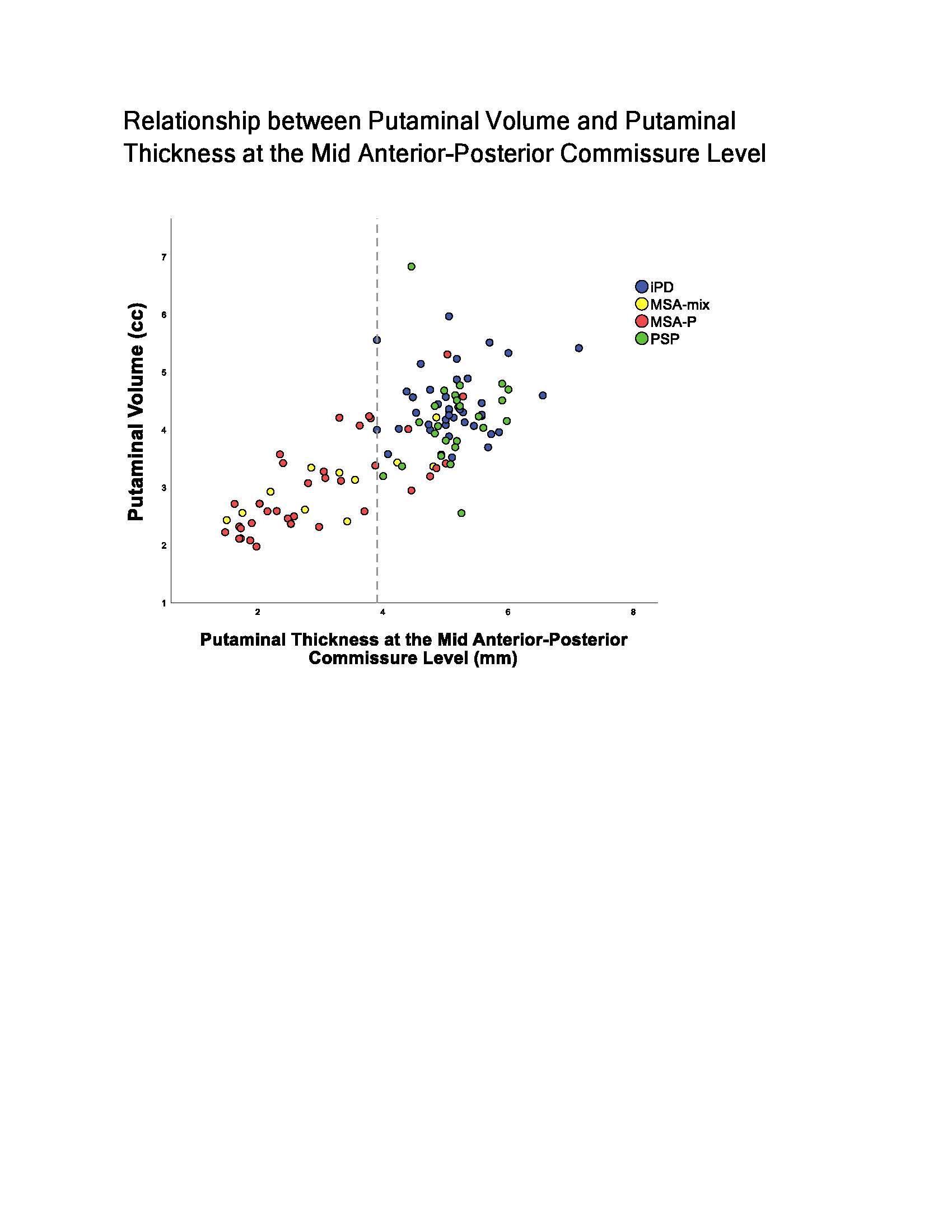 Method: Two readers retrospectively assessed patients presenting with parkinsonism who underwent 3.0T MRI from 2011-2024 at our institution. Putaminal thickness was measured at the anterior commissure (AC) line and the midline between the AC and posterior commissure (mid AC-PC). Relative measurements were calculated as a percentage of putaminal thickness relative to inner table diameter. Automatic volume estimates of putaminal and total intracranial volume were obtained using FreeSurfer.