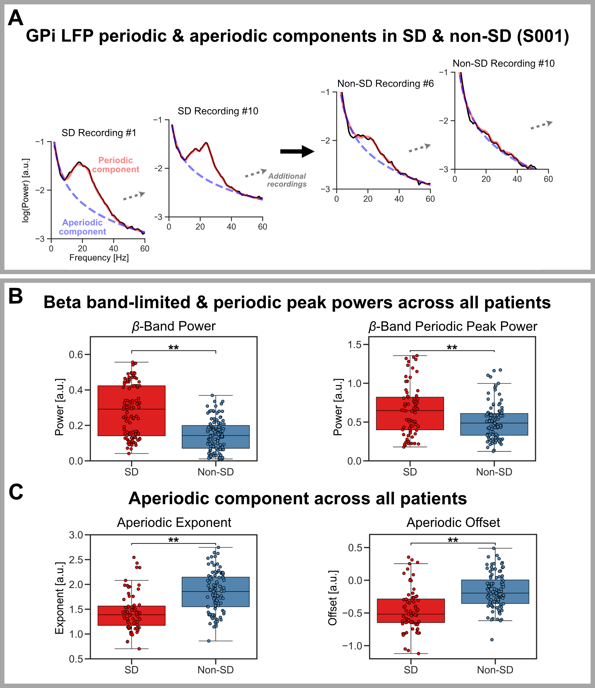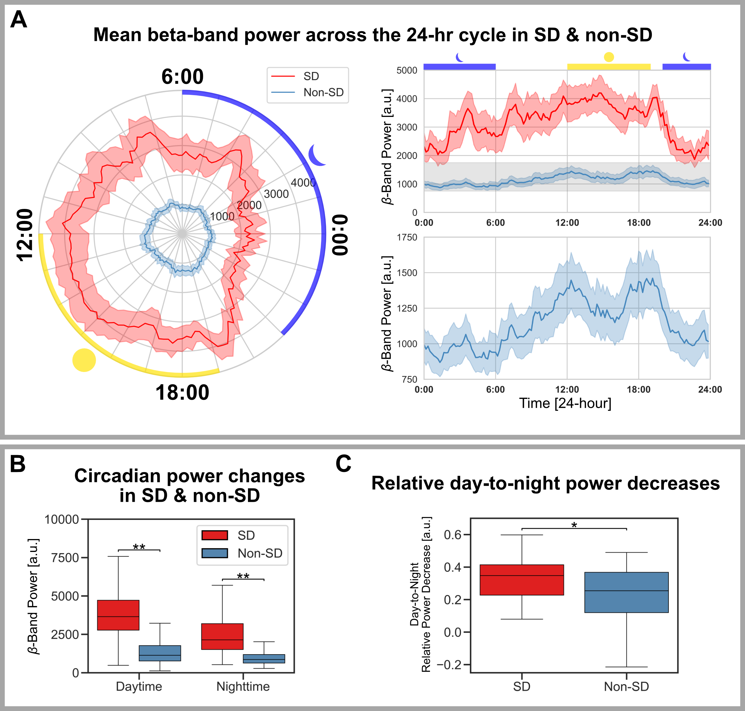 Results: During SD, periodic activity in the beta-band increased across all patients and recordings [figure1](B), with increased periodic peak power [figure2](B) (p=0.007) and beta-band burst amplitude [figure3](B&C) (p<0.001). Relapsed SD was characterized by return of excessive beta signatures [figure1](C). Beta-specific LFP power alone was significantly associated with worse quality-of-life scores [figure4] (PedsQL, p=0.03, R2=0.695). Circadian beta-band periodicity was present [figure5](A), with significantly increased power across daytime (p<0.001) and nighttime (p<0.001) during SD [figure5](B).