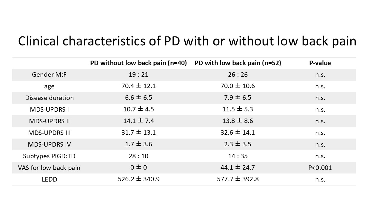 Results: The mean age of the patients was 70.2±11.3 years, the mean disease duration was 7.4±6.5 years, and the mean MDS-UPDRS part 3 score was 32.2±13.6. Fifty-two patients (56%) had back pain, and there were no differences in clinical symptoms, disease duration, etc. between patients with and without back pain.