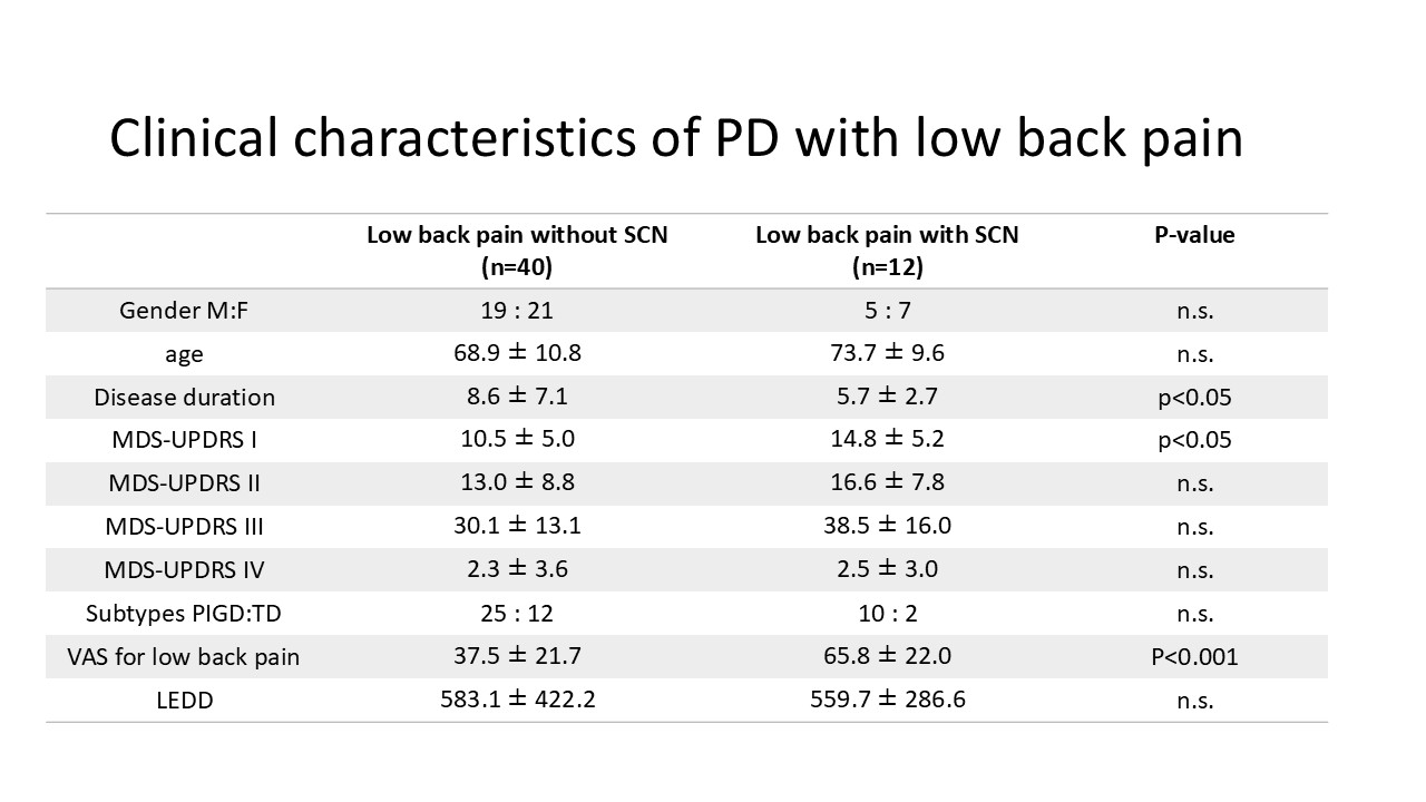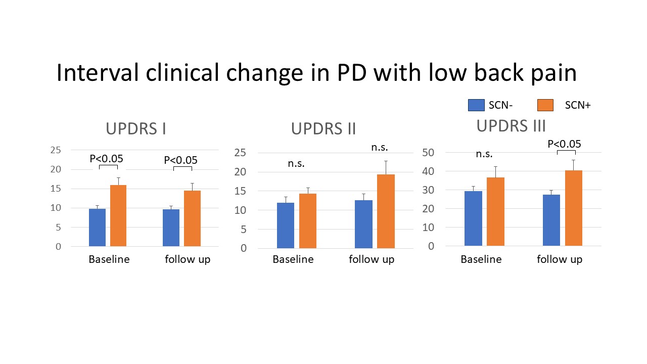 Method: We evaluated the presence or absence of back pain and the presence or absence of symptoms characteristic of SCN damage in 92 consecutive PD patients who were outpatients at our hospital, in addition to evaluating their clinical symptoms. We also re-evaluated 61 patients after 1 year. At 1 year follow-up, patients with SCN still had higher UPDRS part 1 scores and there was a trend towards greater reduction in motor symptoms.