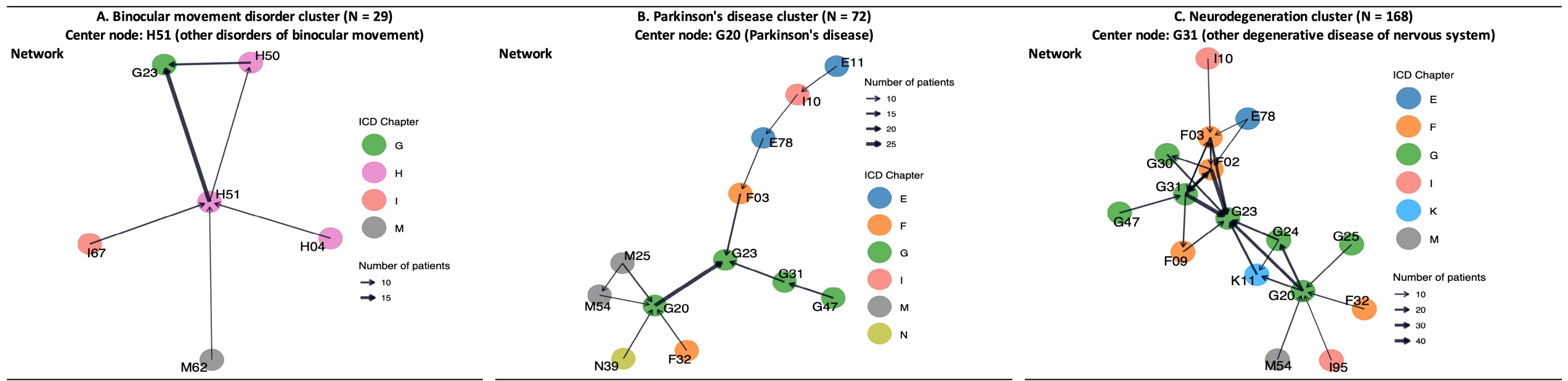 Results: Among 1,205 PSP patients, 247 were included in the final analysis, with 258 unique multi-step PSP disease trajectories identified. Three trajectory clusters emerged: 1) binocular movement disorder (e.g., cerebrovascular diseases → disorders of binocular movement → PSP; N=29), 2) Parkinson’s disease (e.g., joint disorder → Parkinson’s disease → PSP; N=72), and 3) neurodegenerative diseases (e.g., sleep disorders → degenerative nervous system diseases → PSP; N=168). Significant differences in demographics, symptoms, and PSP subtype distributions were observed across clusters, with 36.8% of trajectory edges identified as causal.