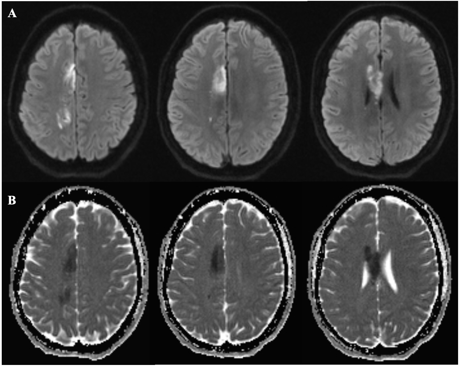 Results: Brain MRI showed acute ischemic infarct in the distal right anterior cerebral artery (ACA) territory involving the right cingulate gyrus, corpus callosum and scattered paramedian frontoparietal infarct (Figure 1). MRA head and neck with contrast were unremarkable. Angiogram showed a subocclusive thrombus at the origin of the right callosomarginal artery, which corresponds to the area of infarct noted on MRI and likely represented in situ thrombosis as opposed to proximal embolic source. Patent foramen ovale (PFO) was confirmed on transthoracic echocardiogram (TTE) and negative duplex ultrasound for deep venous thrombosis. The hypercoagulable work up was pending and the patient was on the dual antiplatelet therapy. She gradually gained normal control of her left hand over the next 48 hours even though there was still the residual left side weakness.