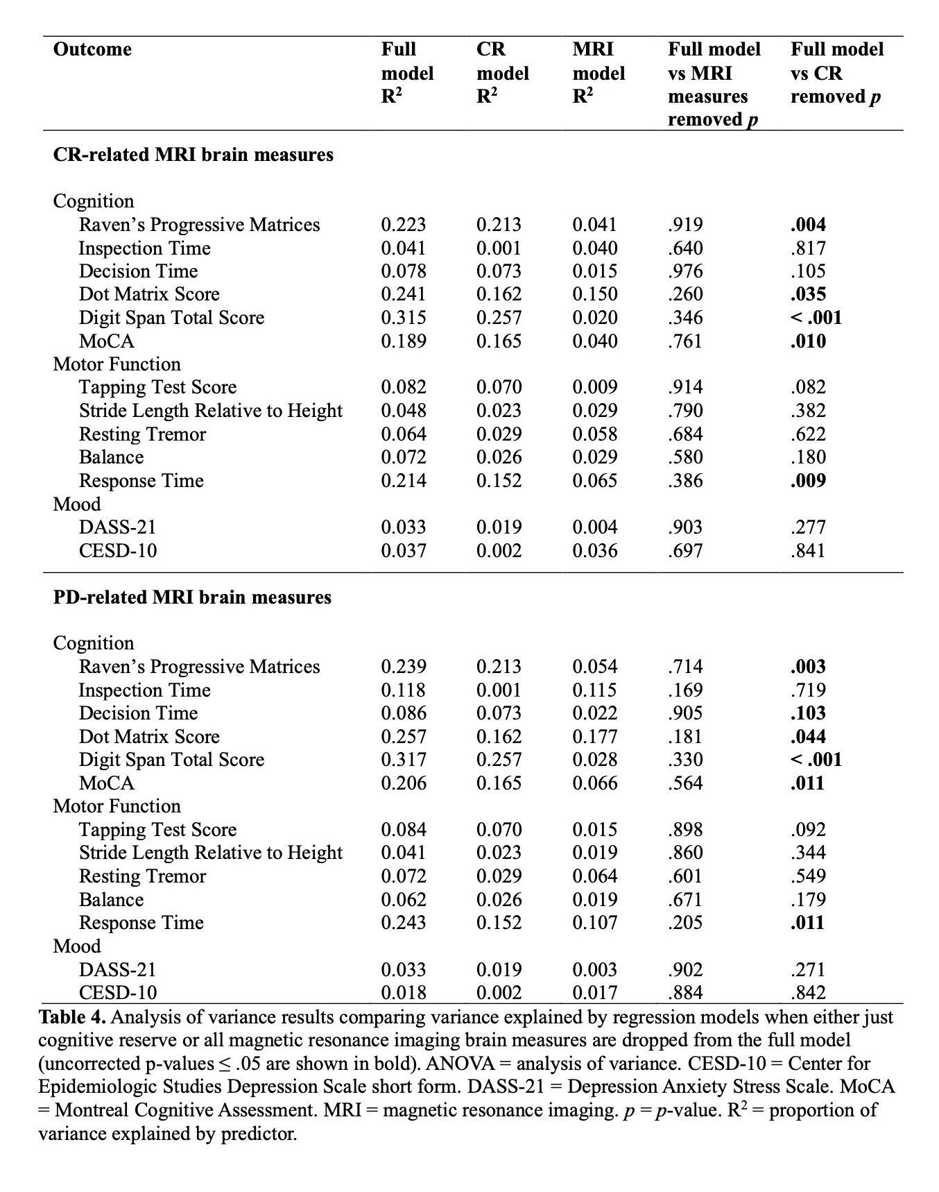 Results: Models including CR-related brain measures found that only CR explained a significant portion of variance in both overall cognition and motor function (Table 3). CR was also the only significant predictor of overall cognition and motor function in models that used PD-related brain measures. However, neither CR nor brain measures were significant predictors of mood, and the overall models were non-significant for motor function. ANOVAs of specific outcome models demonstrated that only the removal of CR, but not brain measures, resulted in a significant loss of explained variance for certain tests (Table 4).