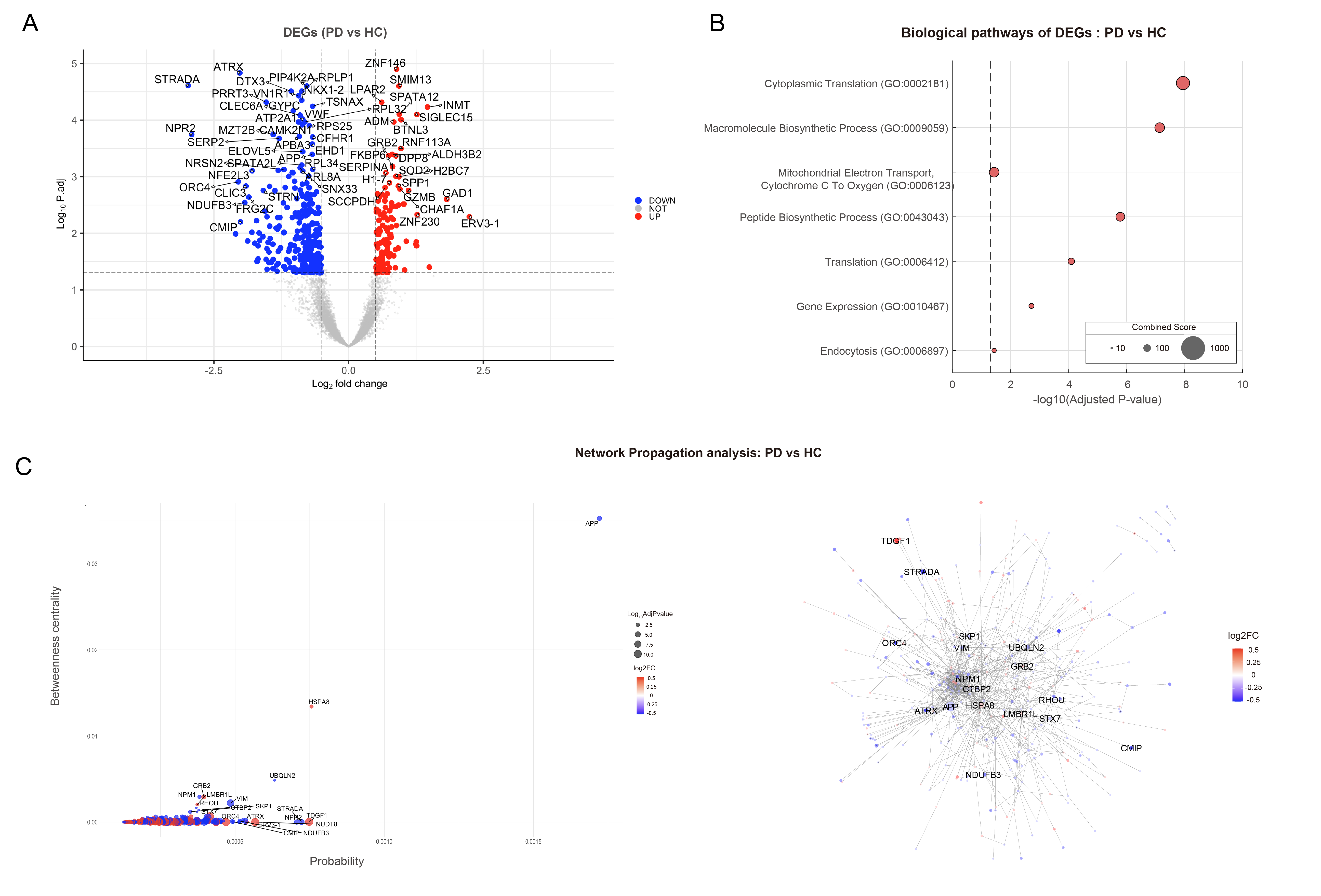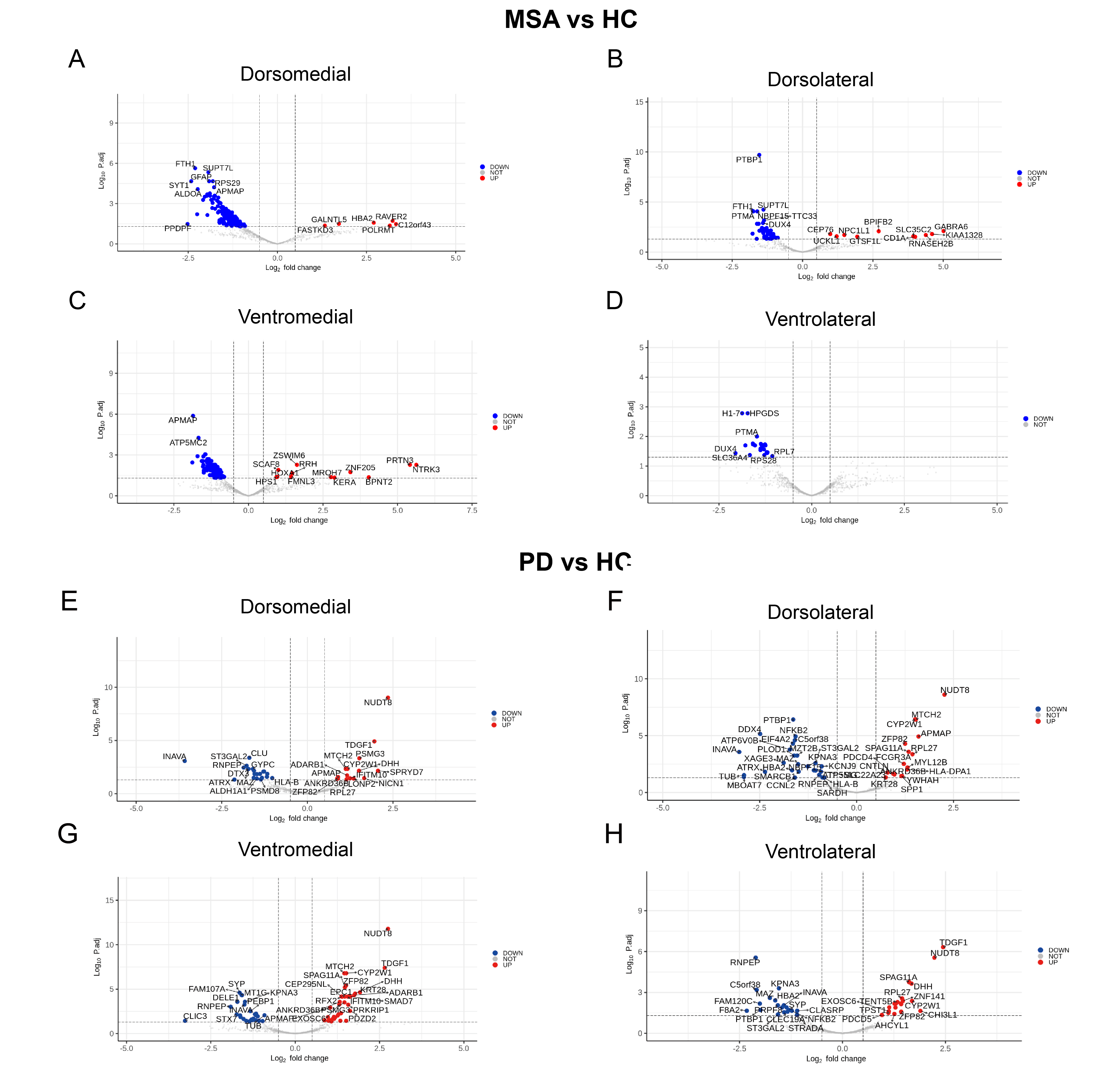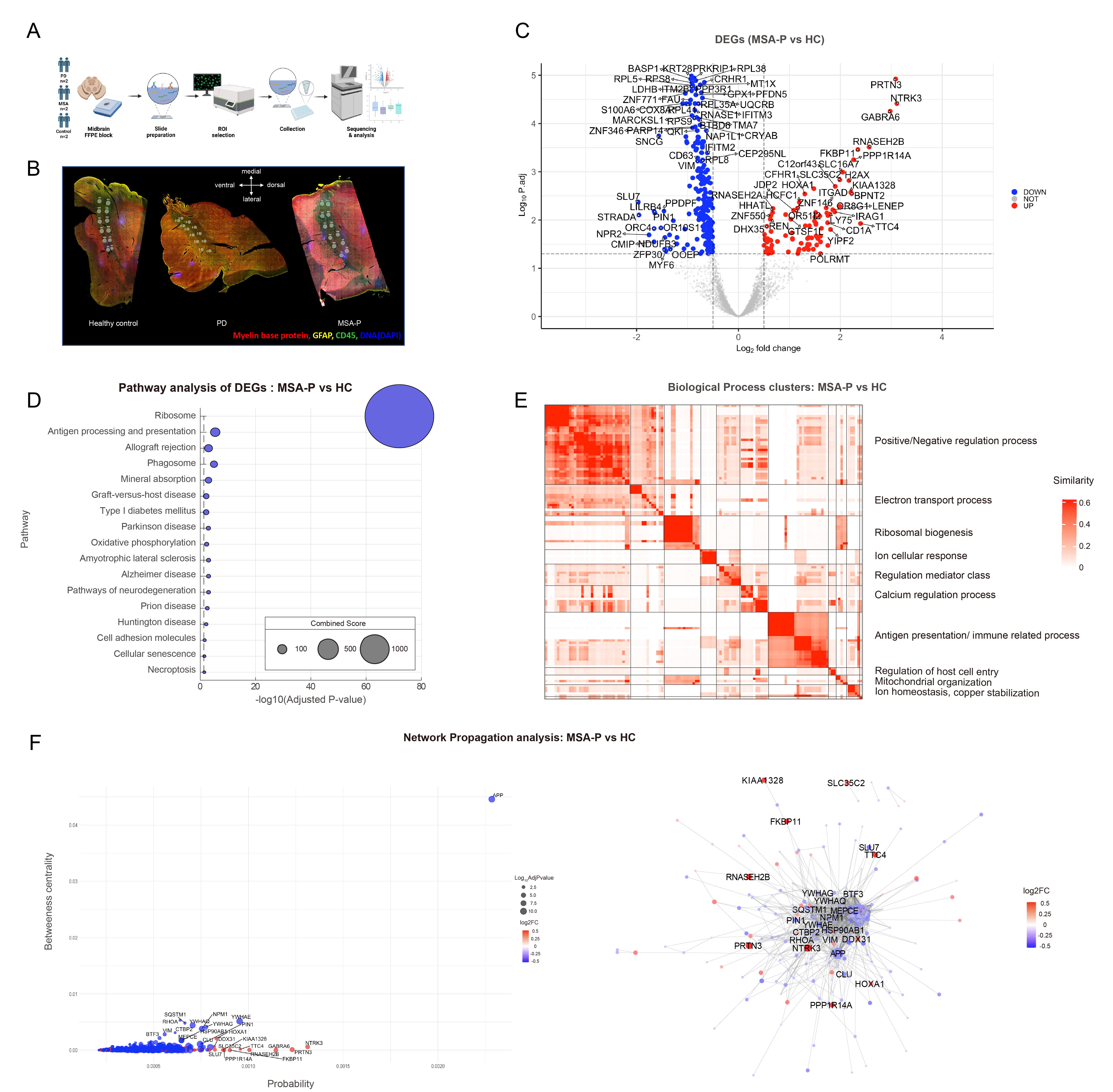 Method: We conducted transcriptome analysis using in-situ hybridization on paraffin-embedded SNpc tissues from postmortem brains. The study included 2 MSA-P patients, 2 PD patients, and 2 healthy controls (HC), with 12 regions of interest (ROIs) selected from the dorsal to ventral and medial to lateral aspects of the SNpc. A total of 72 ROIs from 6 participants were analyzed, and differentially expressed genes (DEGs) were identified by comparing MSA-P, PD and HC groups.