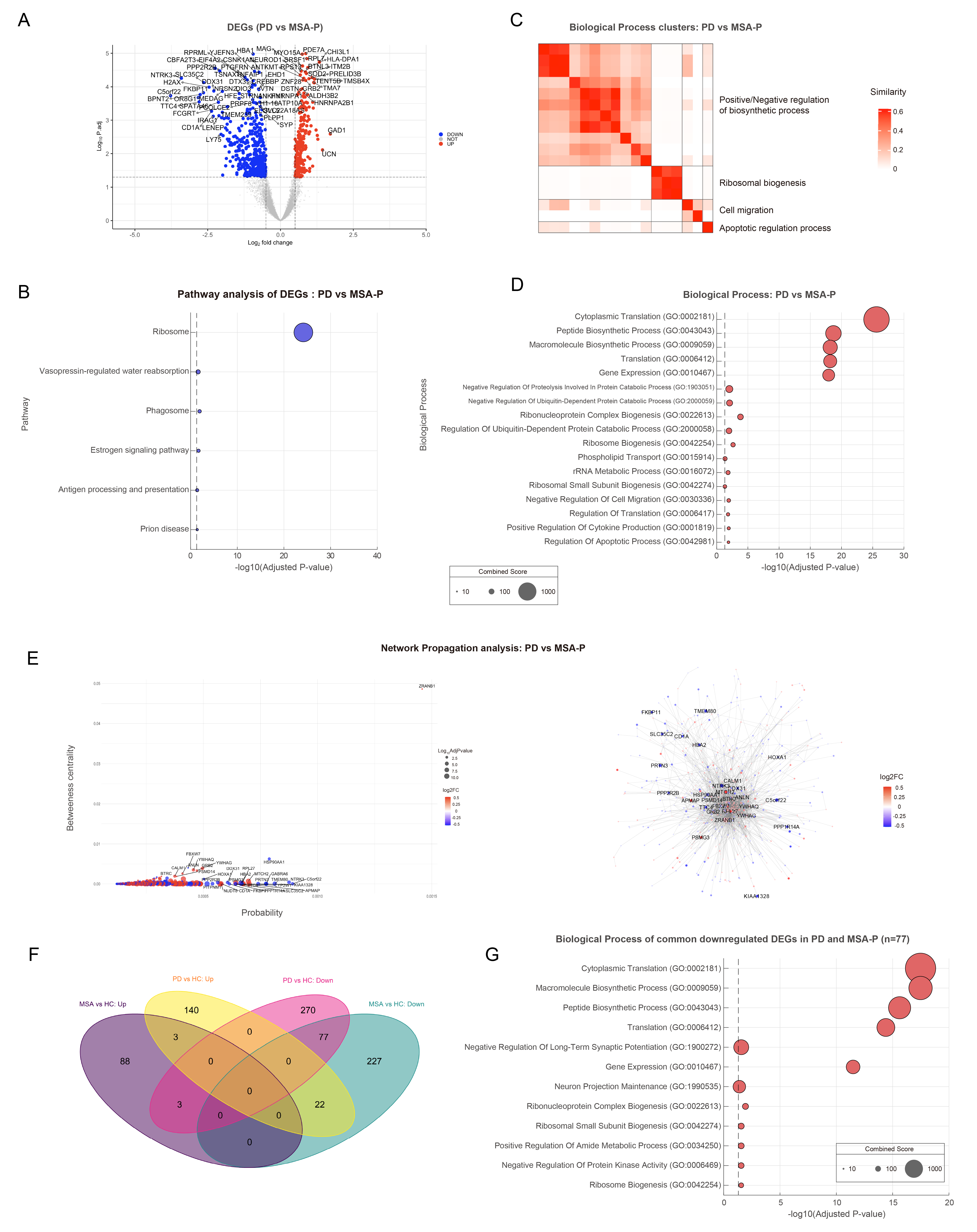 Results: The MSA-P group showed 88 upregulated DEGs and 326 downregulated DEGs (adjusted 𝑝<0.05) compared to HC. The downregulated DEGs were significantly enriched in pathways related to ribosomal translation, immune processes, mitochondrial function, and autophagy. Notably, the dorsomedial quadrant was uniquely linked to antigen presentation, while other quadrants showed downregulation of protein synthesis. The PD group exhibited 165 upregulated DEGs and 350 downregulated DEGs (adjusted 𝑝<0.05) compared to HC, with downregulated DEGs associated with ribosomal translation, mitochondrial function, and the ubiquitin-proteasome system. In both MSA-P and PD, the upregulated DEGs were not associated with any pathways or biological process in gene enrichment analysis. In network propagation analysis, amyloid precursor protein was the most significant network hub among DEGs in both MSA-P and PD. Comparing the transcriptomic signatures of SNpc between MSA-P and PD, we found immune/inflammation, mitochondrial function and neural signaling related genes were significantly downregulated in MSA-P compared to PD.