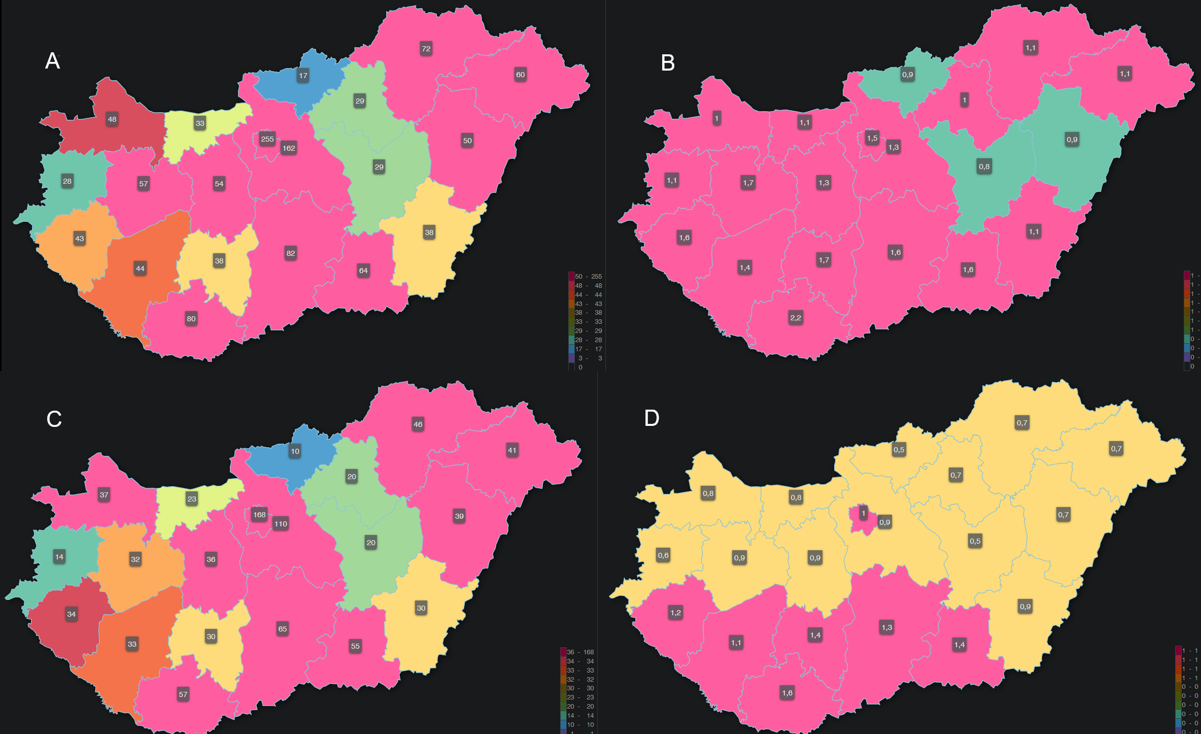 The residence of patients receiving DBS treatment showed a heterogeneous distribution. The proportion of patients receiving DBS treatment is greater than 2/10,000 inhabitants in 1 county (Baranya, 2.2) and less than 1/10,000 in 3 counties out of the 20. The rate of generator replacements has increased steadily and dynamically from 23.3% in 2010 to 50.4% in 2024. A total of 62 cases (2.9%) were coded as DBS reoperations, while the surgical mortality rate was 0.2%. Ninety cases reported immediate complications, of which 56 were infections.