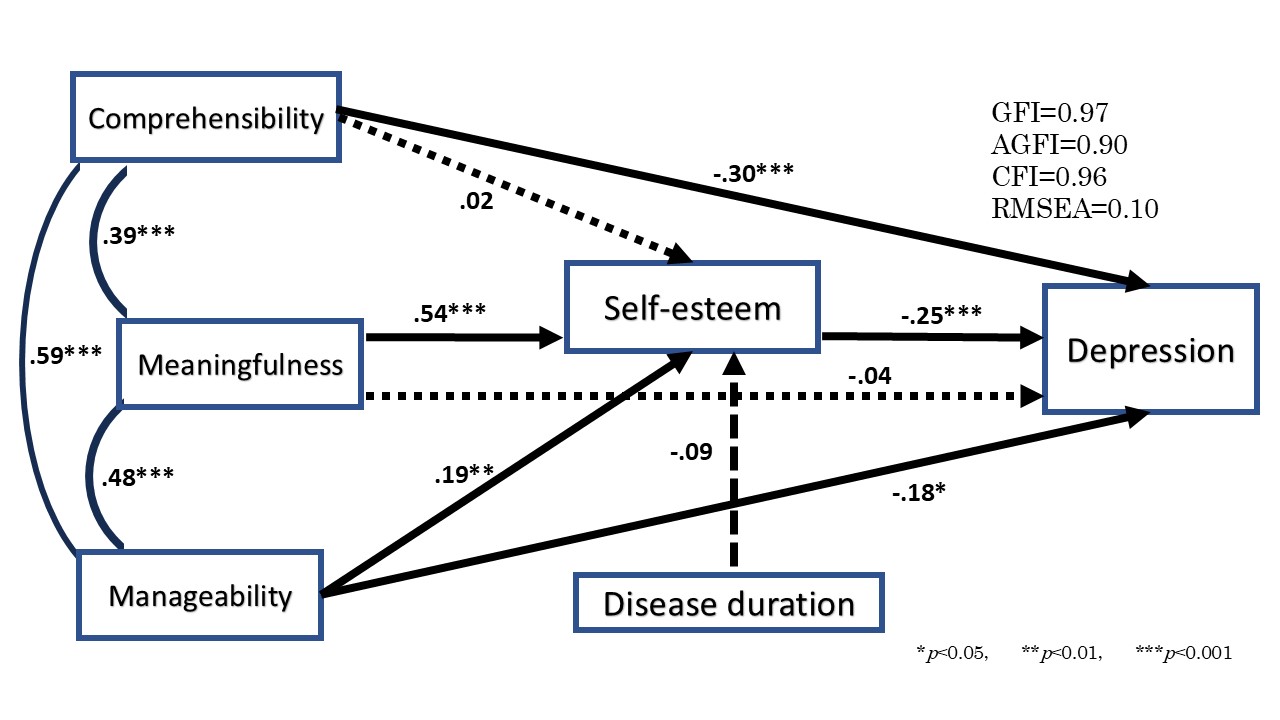 Results: A total of 211 questionnaires were distributed, and 171 valid responses (response rate 81%) were received. The results of the analysis showed that high self-esteem (β = −.25, p < .001), high comprehensibility (β = −.30, p < .001), and high manageability (β = −.18, p < .001) were directly related to low depression. In addition, meaningfulness and manageability were indirectly related to depression through self-esteem. Duration of illness was not significantly related to any of the variables. The model demonstrated a good fit (GFI = 0.97, AGFI = 0.90, and CFI = 0.96), meeting the criteria for statistical validity.