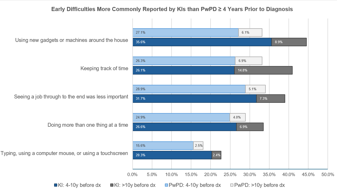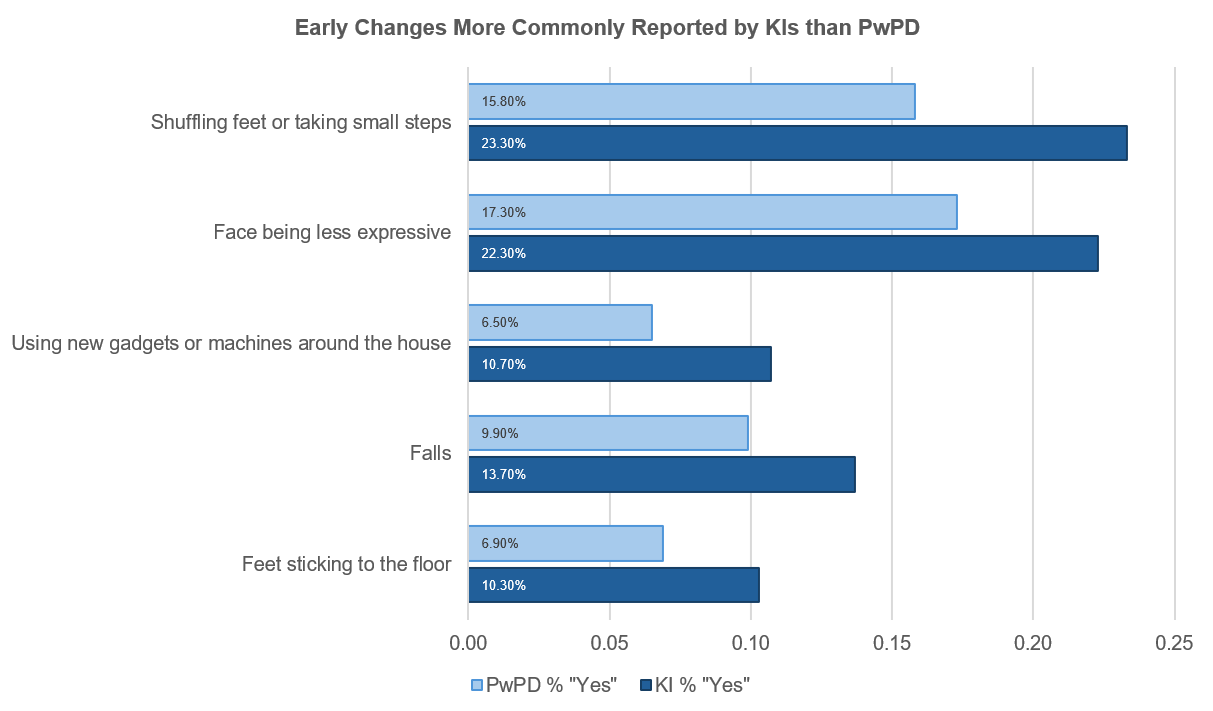 Conclusion: These findings elucidate the potential of KIs in recognizing early changes in PwPD, providing a complementary perspective to PwPD self-reports. KI reporting may facilitate early detection and intervention.